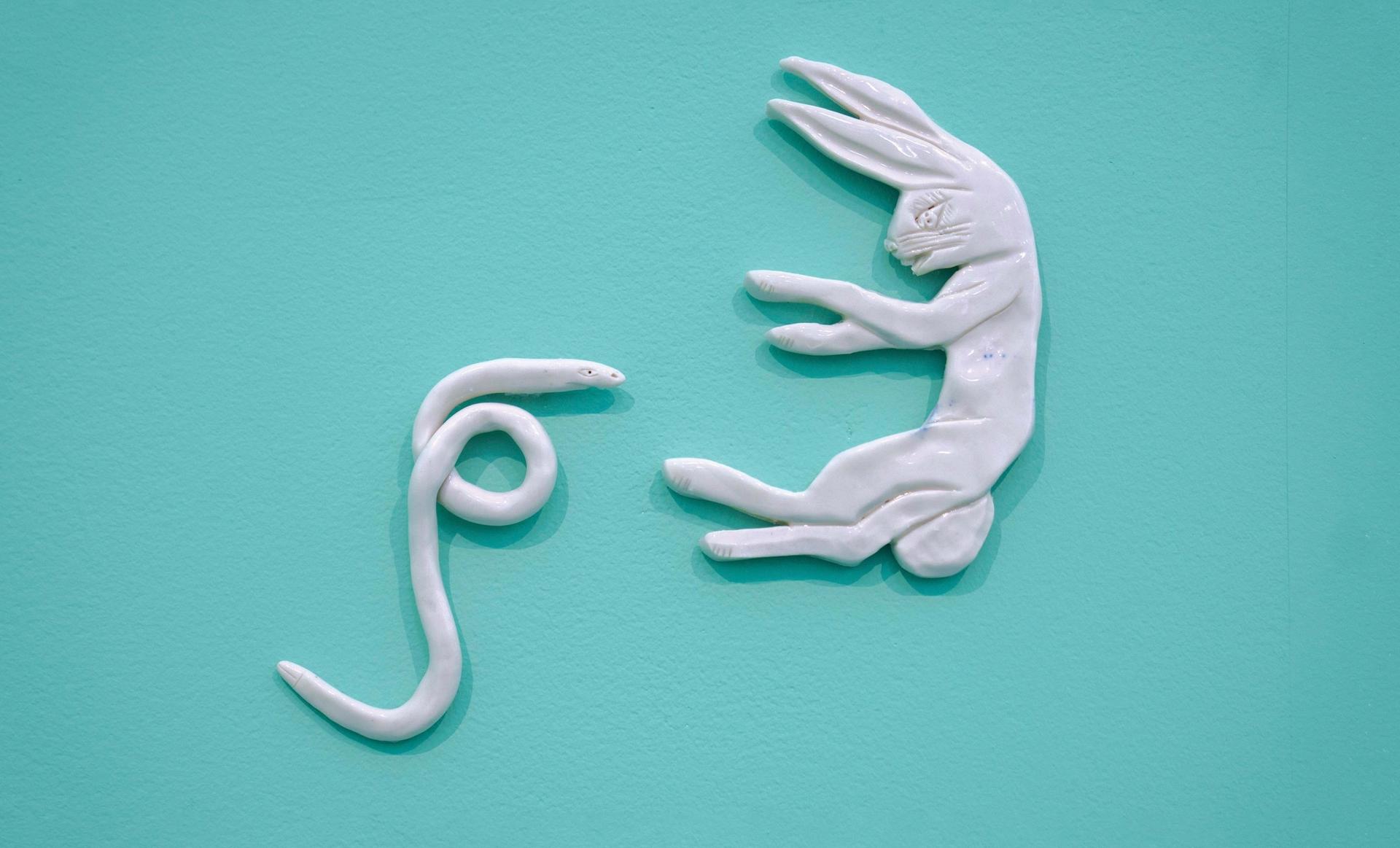 Those stopping by The Pit gallery’s stand will be drawn to its pleasing pastel colours, with the back wall dotted with white squiggles and shapes. Turns out they are ceramic pieces that tell the real-life struggle between a rabbit and a snake that the artist Allison Schulnik witnessed outside her desert abode, south of Joshua Tree. “At first I was afraid for the bunny; I thought he’d be killed,” she says. “Then I realised that the rabbit was the aggressor, sometimes moving in to nip at the snake.” Lucky for him, the snake was not poisonous. How was this standoff resolved? “Well, finally the snake lunged forward, and the rabbit jumped back and ran away.” The scene is depicted in several sections—the snake lunging forward, the rabbit recoiling into a curl. “Fortunately they both came out alive,” she says.