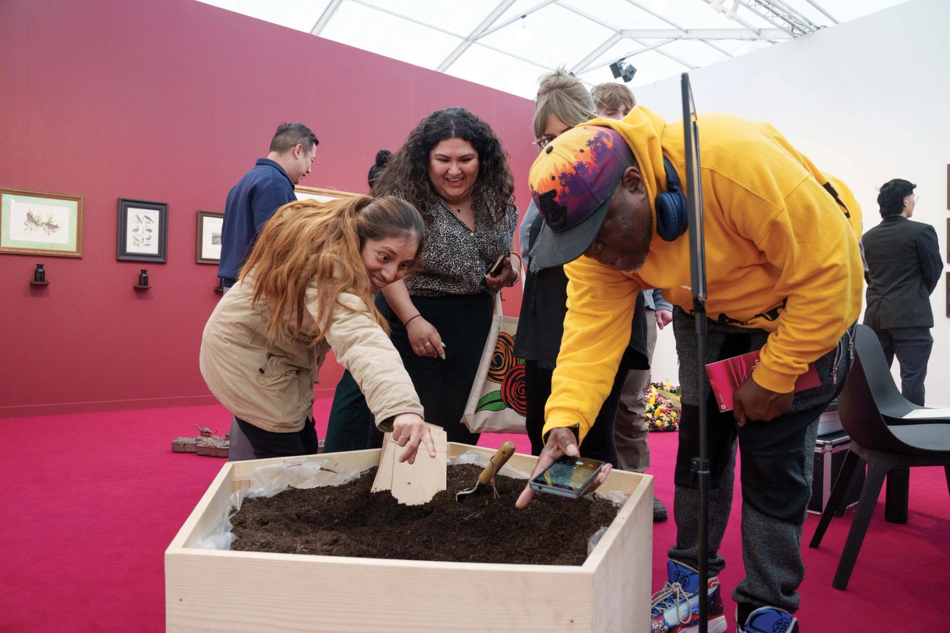 Some visitors to the Los Angeles-founded Various Small Fires stand at Frieze are leaving with more than a painting or sculpture: the gallery is distributing small cloth bags of worm-filled dirt to fertilise their gardens. Each bag is filled from a pentagon-shaped wooden trough (pictured left) created by The Harrison Studio, made up of Newton Harrison and Helen Mayer Harrison, a husband-and-wife duo who pioneered the Ecological Art movement in the 1970s. The materials for Composting in the Pentagon with Worm Tailings (2017) read like a gardener’s shopping list: wood, redworms, steer manure, chicken manure, soil, compost and plastic sheeting. “It was their wish for their work to be disseminated among the public, even if in a small gesture. This is a continuation of that,” says the gallery director Adrian Zuñiga. The work is priced at $30,000 and, on Friday evening, was on hold for a major California institution.