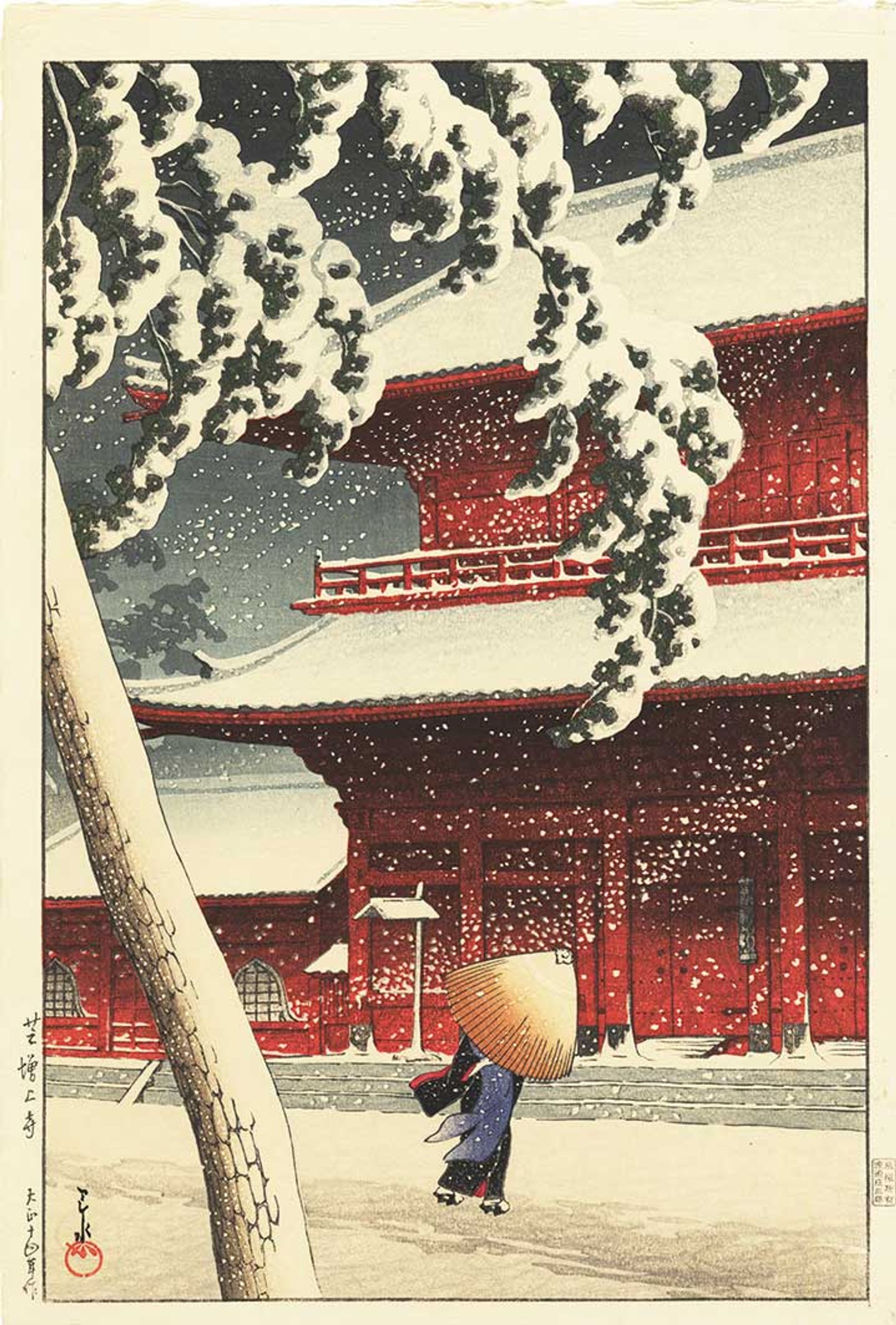 The Shiba Zōjōji print is an example of Shin-Hanga, or New Prints, an artistic movement that blended Western influence with traditional Japanese woodblock printing and was popular from around 1910 to 1960. The work is part of the series Tokyō Nijūkkei (20 views of Tokyo) and depicts the ninth-century Zojoji Temple. The image captures both the temple and a lone figure battling the snow and wind—a possible symbolic reference to the indomitable spirit of Tokyo, which was rebuilding after the devastating Great Earthquake of Kanto just two years earlier. “The design of the print is perfect: the movement is marked both by the snowflakes and by this character facing the elements, the red temple is immutable, there is a balance that everyone feels,” says Tamio Ikeda, the founder of Galerie Tanakaya.