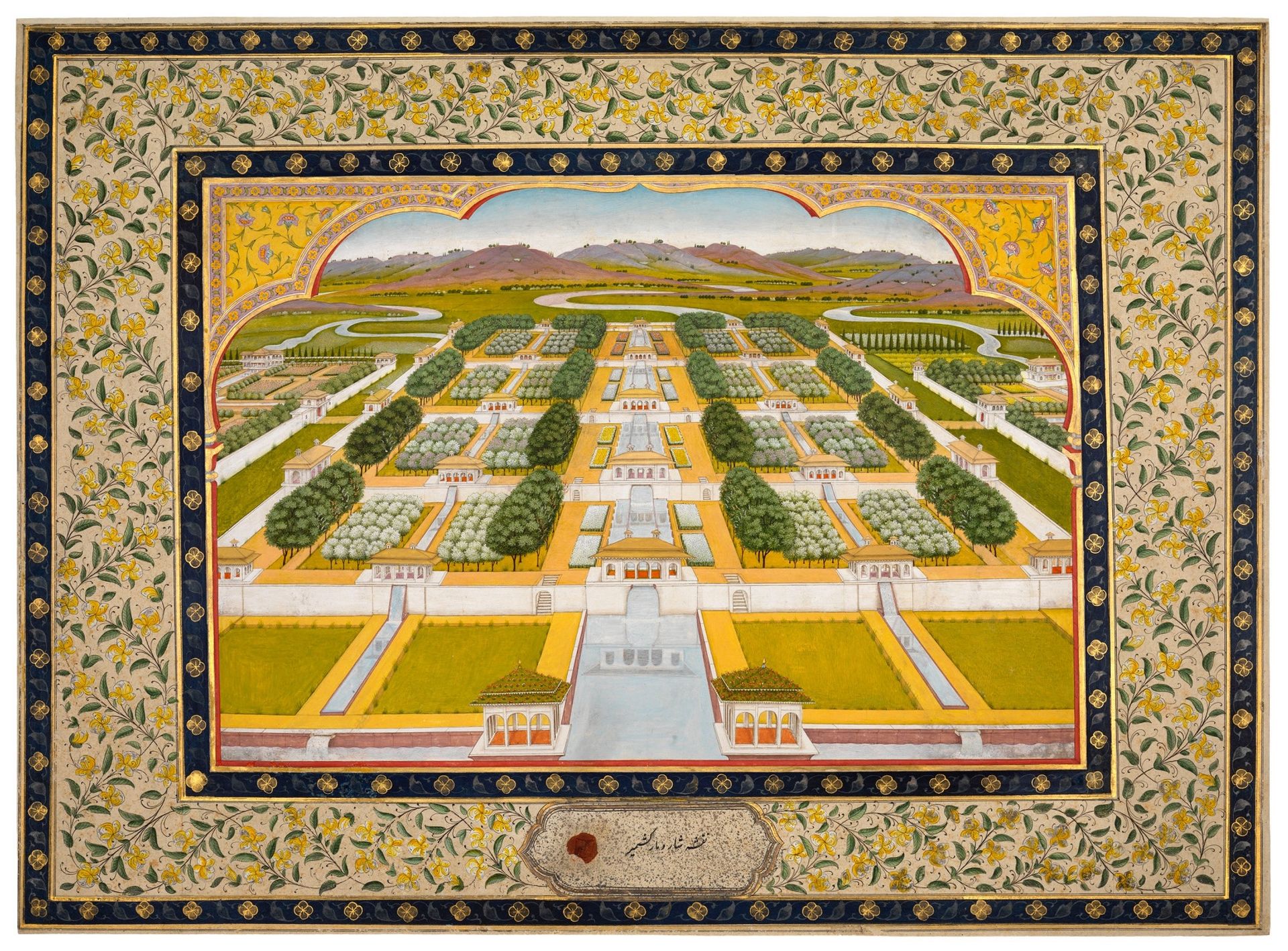 A view of Shalimar Bagh, a leaf from an album made for Antoine Polier, attributed to Mihr Chand with calligraphy by Hafiz Nur Ullah (around 1780), was placed by Prahlad Bubbar gallery of London early at Tefaf Maastricht in 2024