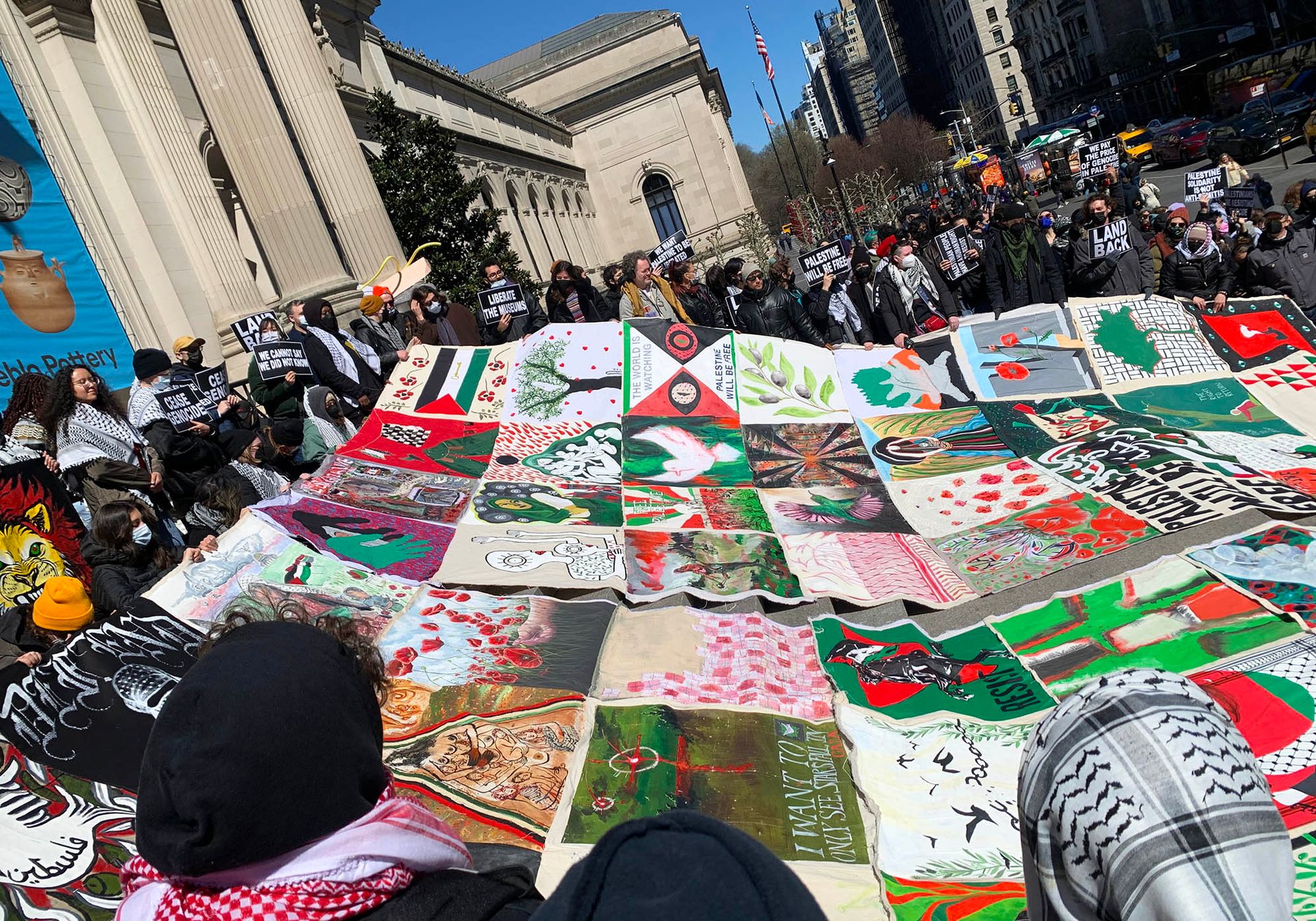 Hundreds of artists, cultural workers and activists gathered on the steps of the Metropolitan Museum of Art on Fifth Avenue in New York on Sunday (24 March), demanding that the most visited museum in the US publicly call for a ceasefire in the war in Gaza and commit to preserving Palestinian cultural heritage. The protesters unfurled a 30ft by 50ft collaborative quilt featuring sewn, painted and printed designs by more than 60 artists expressing solidarity with Palestinians.