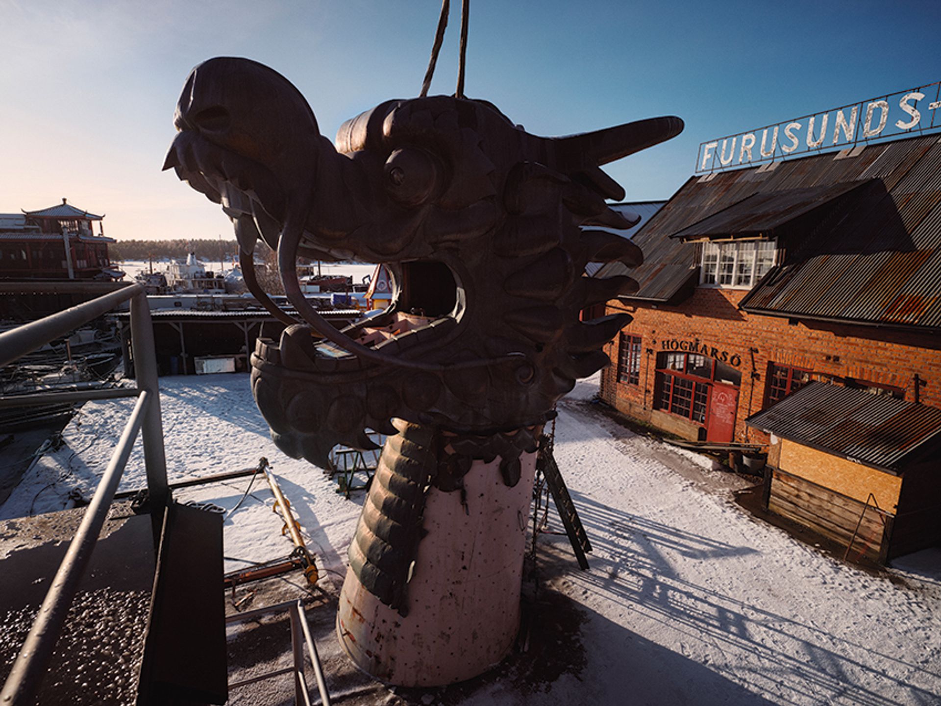 A dragon head by Lu Guangzheng marks Altersea Opera, an installation by Lap-See Lam for the Nordic Pavilion Photo: Matthias Lindbäck/Moderna Museet