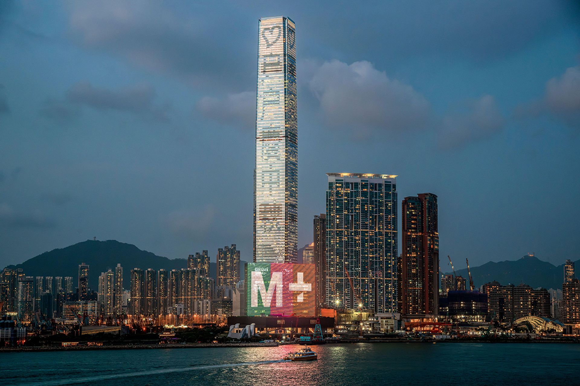 Lighting up the city: the 110m-wide M+ Facade displays artworks programmed by the M+ museum, a building around twice the size of Tate Modern in London Bob Henry/Alamy Stock Photo