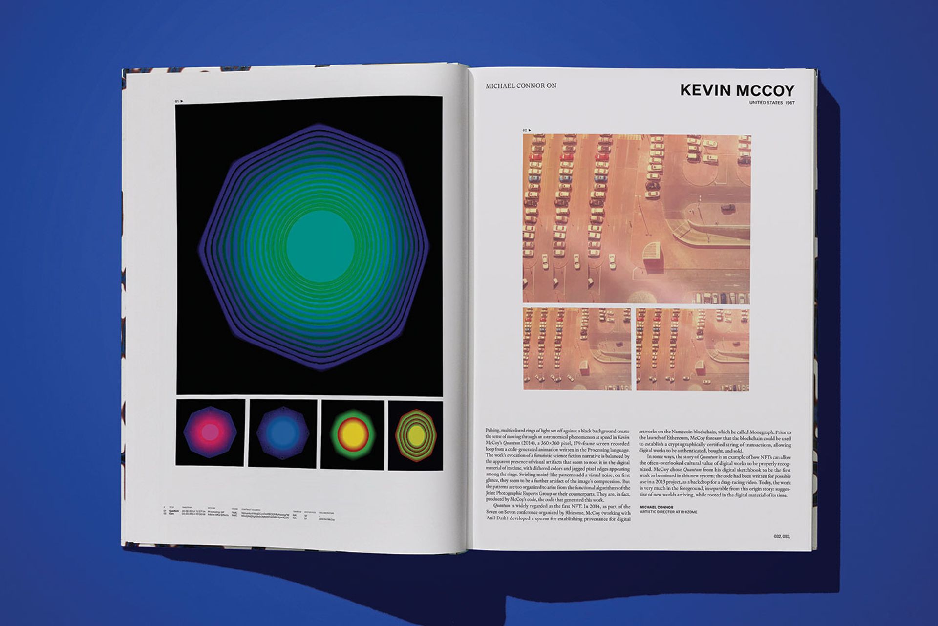 Respect to the work: The opening pages of the profile in On NFTs of the artist Kevin McCoy and (left-hand page) his world-first NFT Quantum (2014) Artwork: Courtesy Kevin McCoy; Book: Courtesy Taschen