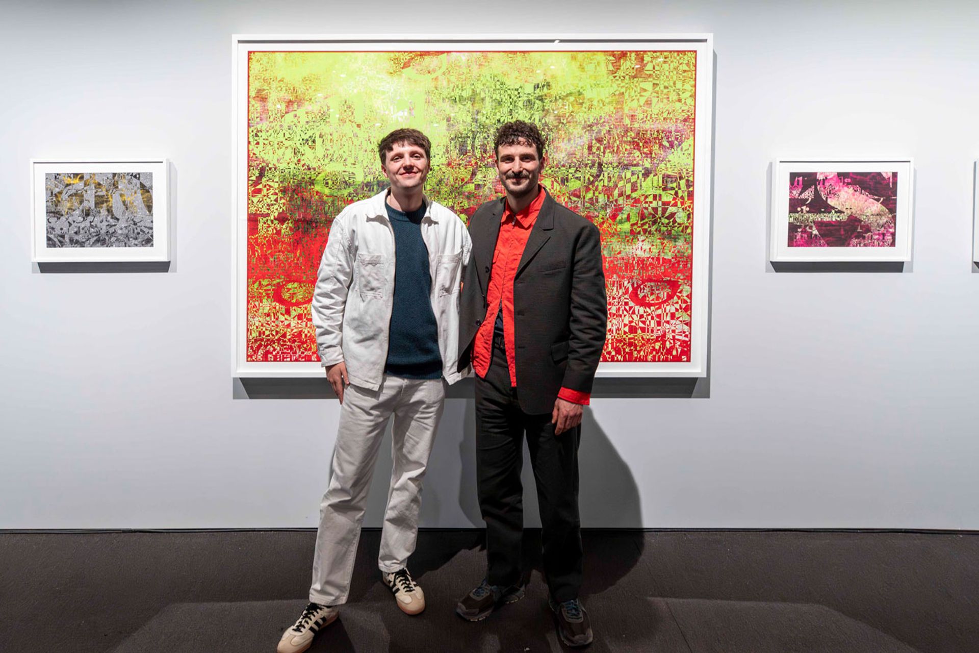 Robert Alice (right) with Cosmo Lindsay, project manager and head of research at Studio Robert Alice, at the launch of the auction of SOURCE [On NFTs] at Christie's New York on 8 March. The artworks are prints of test outputs of Alice's generative art algorithm Courtesy Robert Alice
