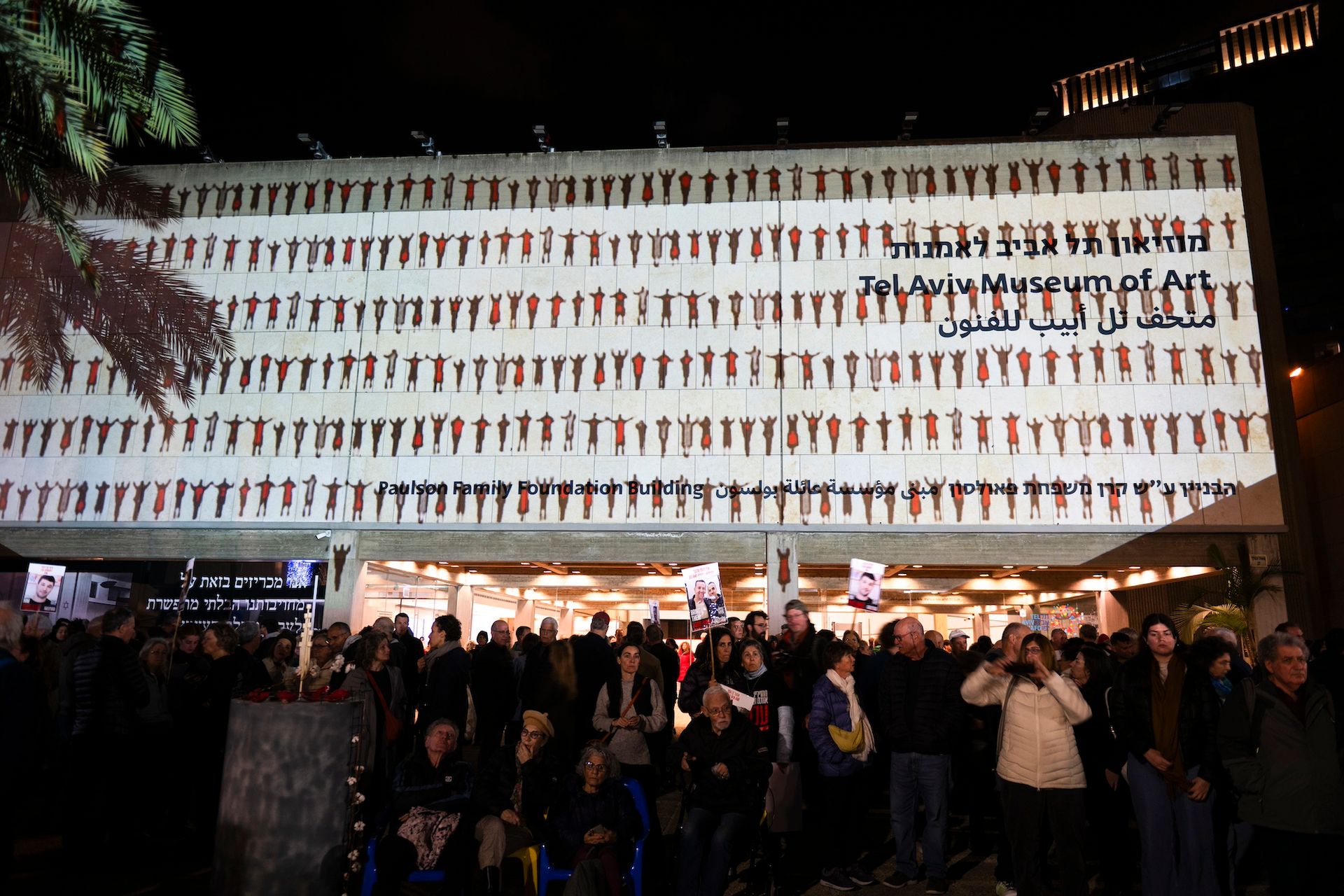 Others have created work about the present moment and facilitated its use as part of the demonstrations to reach a hostage release deal. A video work by internationally acclaimed artist Michal Rovner, titled Signaling (2023), was screened on the facade of the Tel Aviv Museum of Art in collaboration with the Hostage and Missing Families Forum, during the weekend of 12 January to mark 100 days of captivity for the remaining hostages. Painter Zoya Cherkassky, whose series about the events of 7 October was exhibited recently at New York's Jewish Museum, also projected works from that series in Hostages Square, as were works by Zeev Engelmayer and Oren Fischer and the former director of Be’eri Gallery, Ziva Jelin.