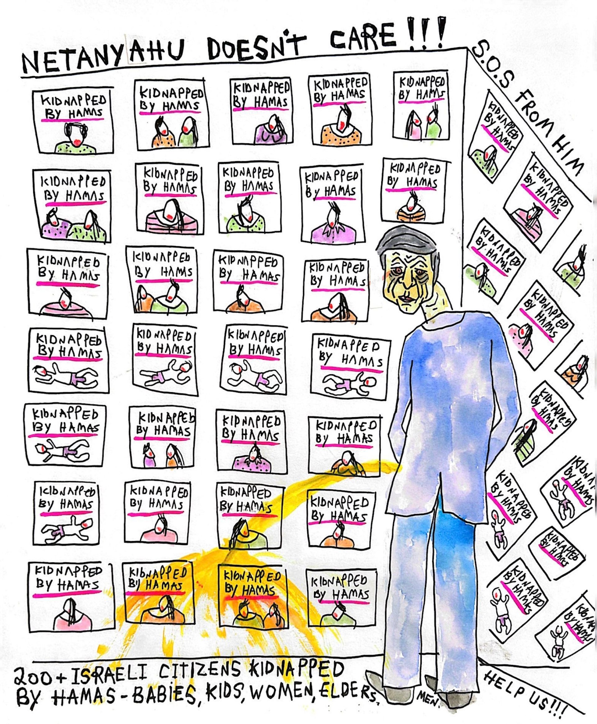 Fischer, whose solo exhibition Lost Works will open at Düsseldorf’s Stadtmuseum in June, has produced several drawings criticising Netanyahu and demanding the release of the hostages. In one drawing, Netanyahu urinates on a wall plastered with fliers of the hostages, under a banner that reads, “Netanyahu doesn’t care!!!”