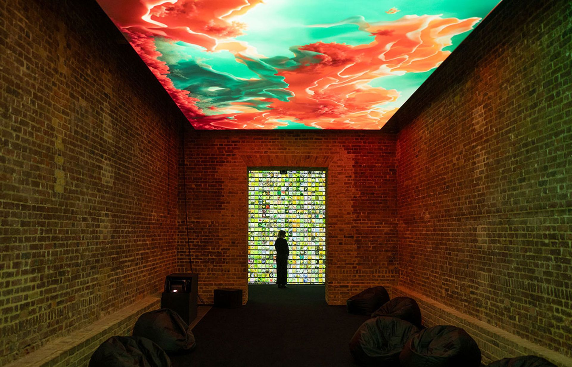 “All about shifting perspectives”: In one of the smaller crosswalk spaces at Serpentine North, video output is projected on the ceiling—bean bags provided Refik Anadol, Echoes of the Earth: Living Archive, 2024. Installation view, Serpentine North. Photo: Hugo Glendinning. Courtesy Refik Anadol Studio and Serpentine
