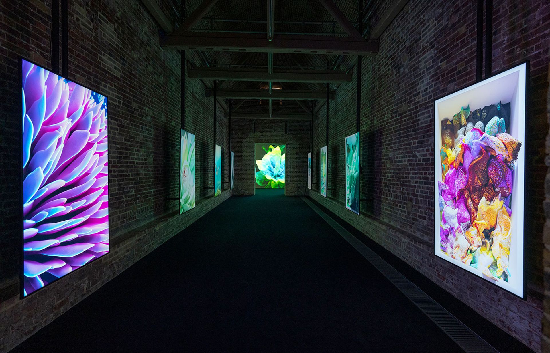 As part of demonstrating process, Anadol displays arrays of some of the millions of source images that his Large Nature Model is trained to turn into text-to-image generative video Refik Anadol, Echoes of the Earth: Living Archive, 2024. Installation view, Serpentine North. Photo: Hugo Glendinning. Courtesy Refik Anadol Studio and Serpentine
