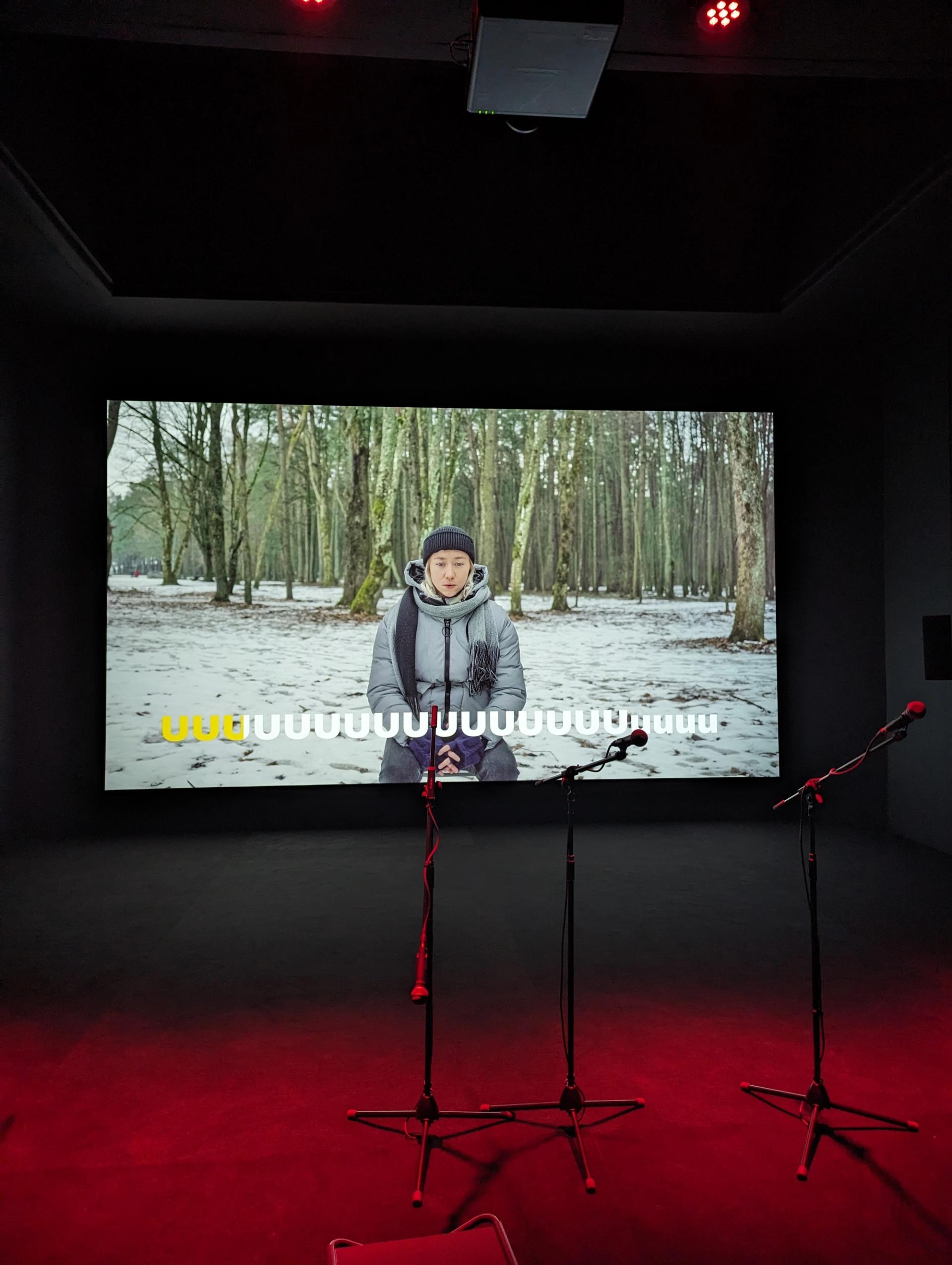 Repeat After Me II, by the Ukrainian collective Open Group, records ordinary Ukrainians mimicking the noises they now have an unwanted familiarity with. They then urge the audience to “repeat with me”.