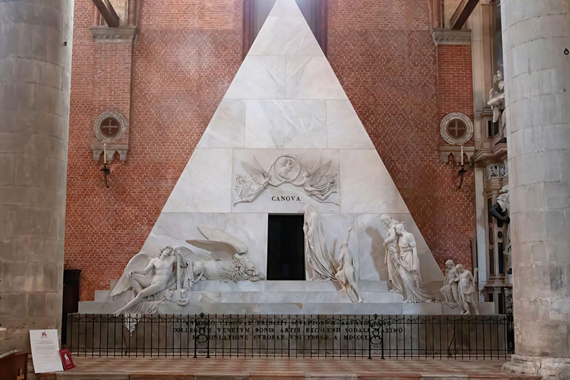 Though not hosting a Biennale exhibition, the spectacular Santa Maria Gloriosa dei Frari is worth a visit in itself because of the absolute masterpieces it contains. As well as being the largest church in Venice, Santa Maria Gloriosa houses Titian’s tomb and one of his greatest works, the near 5m-tall Pesaro Madonna (1519-26). The painting hangs in the basilica for which it was painted five centuries ago and depicts its commissioner Jacopo Pesaro alongside members of his family in a scene showing the Virgin Mary, Christ child and Saint Peter. Although the church’s brick exterior is not as grandiose as others in the city, it more than makes up for it with its interior treats. Beneath its vaulted Gothic ceiling are, among other treasures, a painted wooden sculpture of Saint John the Baptist by Donatello, a white marble pyramid monument to Antonio Canova (pictured above), an exquisitely worked wooden choir screen, and Giovanni Bellini’s Madonna and Child with Saints Nicholas of Bari, Peter, Mark, and Benedict (1488). John Ruskin called the latter one of “the best pictures in the world”, but the same could be said for several examples found in the church.