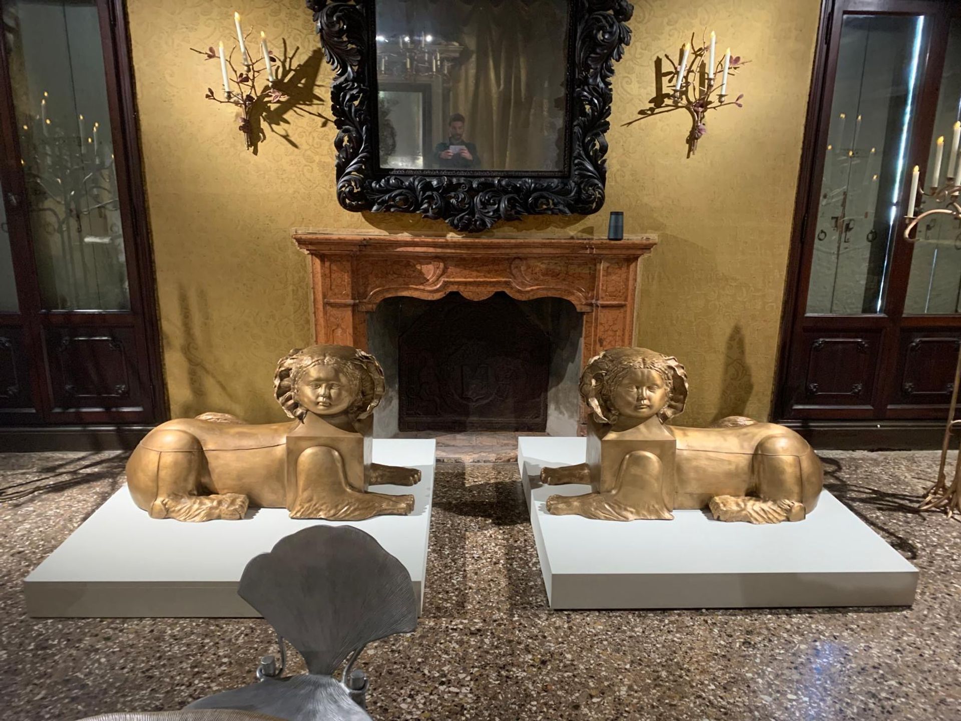 Claude and François-Xavier Lalanne created some of the most coveted sculptures of modern times, and yet what is not discussed enough is how utterly terrifying a large proportion of their output actually was. Walking into the first-ever Venetian show of their work is a little like entering a horror-film pet shop: there are fish with cavernous holes in their bellies, a bulgy eyed grasshopper “bar” and baguettes marching on two rows of human feet. Nothing, however, quite says “burn it with fire” like this pair of baby-faced sphinxes resting in the “Salle à Manger”. These works, according to a statement, recall “the taste for innocence in Claude’s imaginary world”. Where exactly the innocence lies in these death-eyed toddlers with hairy paws is not immediately clear.