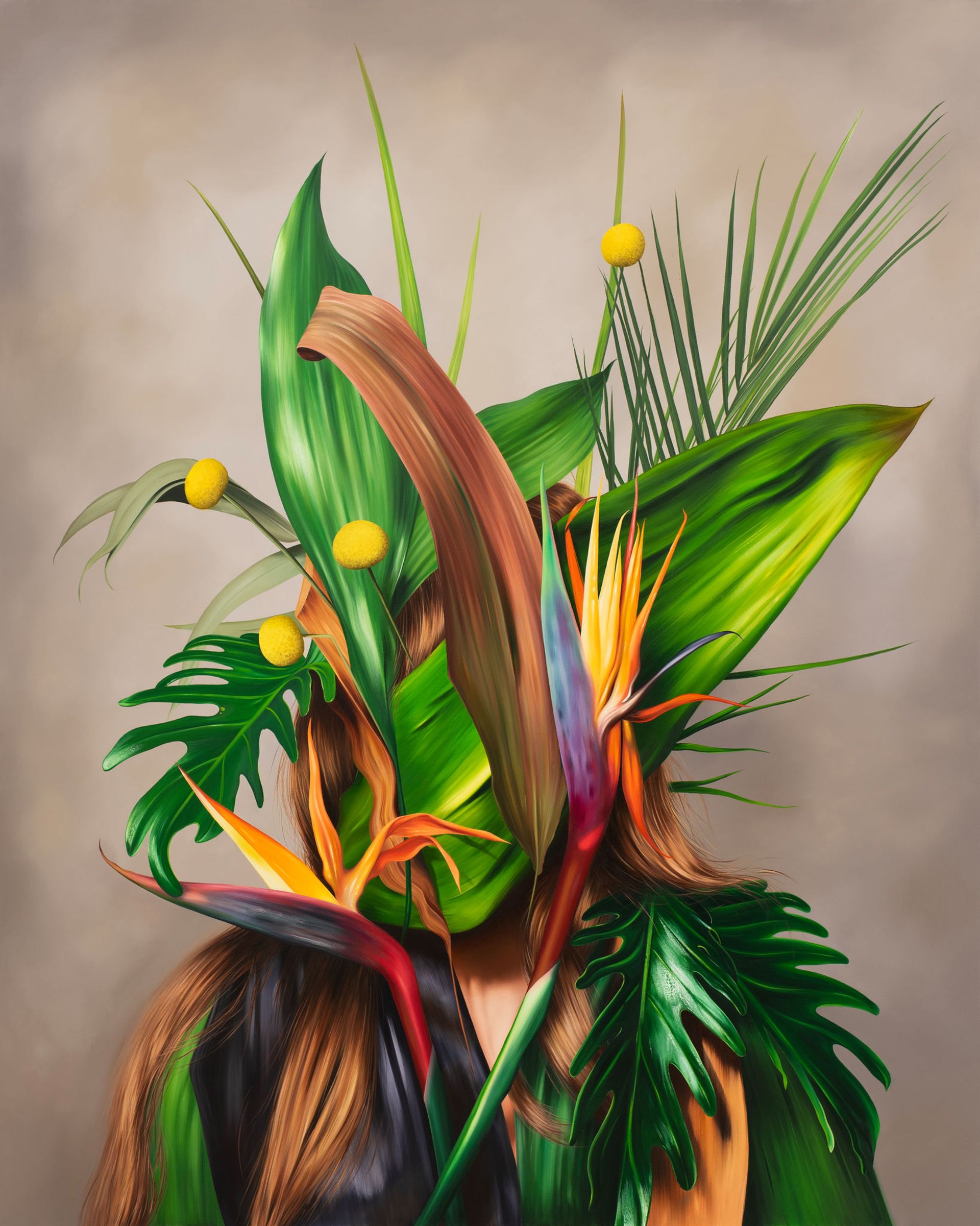 Locks with Leaves and Swellings Buds at Venice’s Palazzo Cavanis (until 1 September) shows how she has progressed in this mission over the past five years, through a variety of approaches to a subject. Included among the 15 works, all completed since 2019, is Untitled (after Joseph van Lerius) (2020), where thick locks of blonde hair obscure the female subject’s face. There is also Bird of paradise (2023), where the central figure is almost entirely engulfed by foliage, and Lady with a Pearl (after François Gérard) (2024), where a woman is enveloped by a vibrant red cloth, a single pearl dangling from her head.