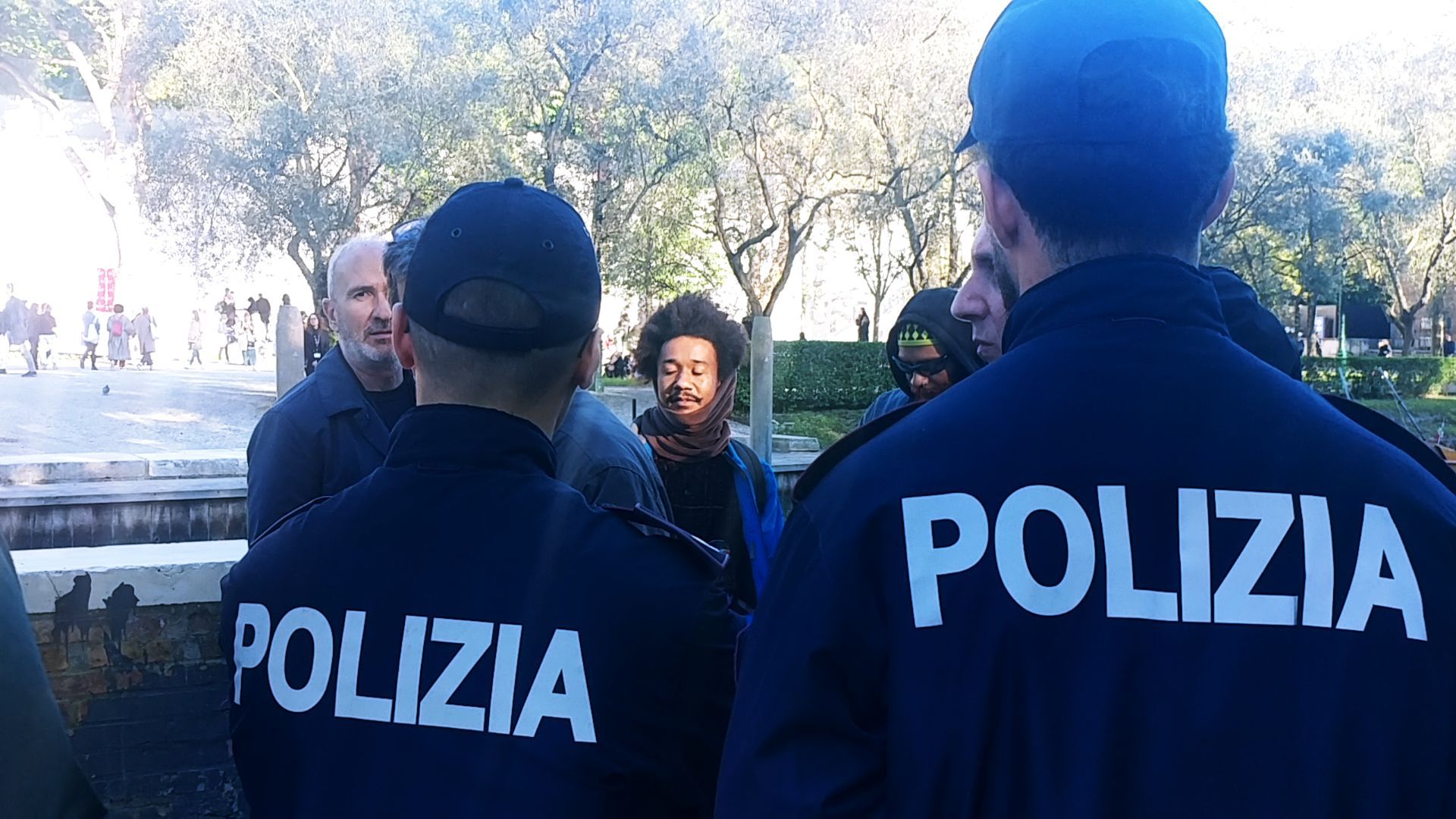 After a few minutes, a larger team of Italian police—some uniformed, some not—arrived and moved the protester towards the back of the pavilion away from public view. Several of the bystanders, including this reporter who was at the scene by chance, followed out of concern for how the police might treat the protester. Police demanded this reporter stopped filming, claiming that it was illegal to film the police in Italy. She was held and had her passport temporarily taken.
