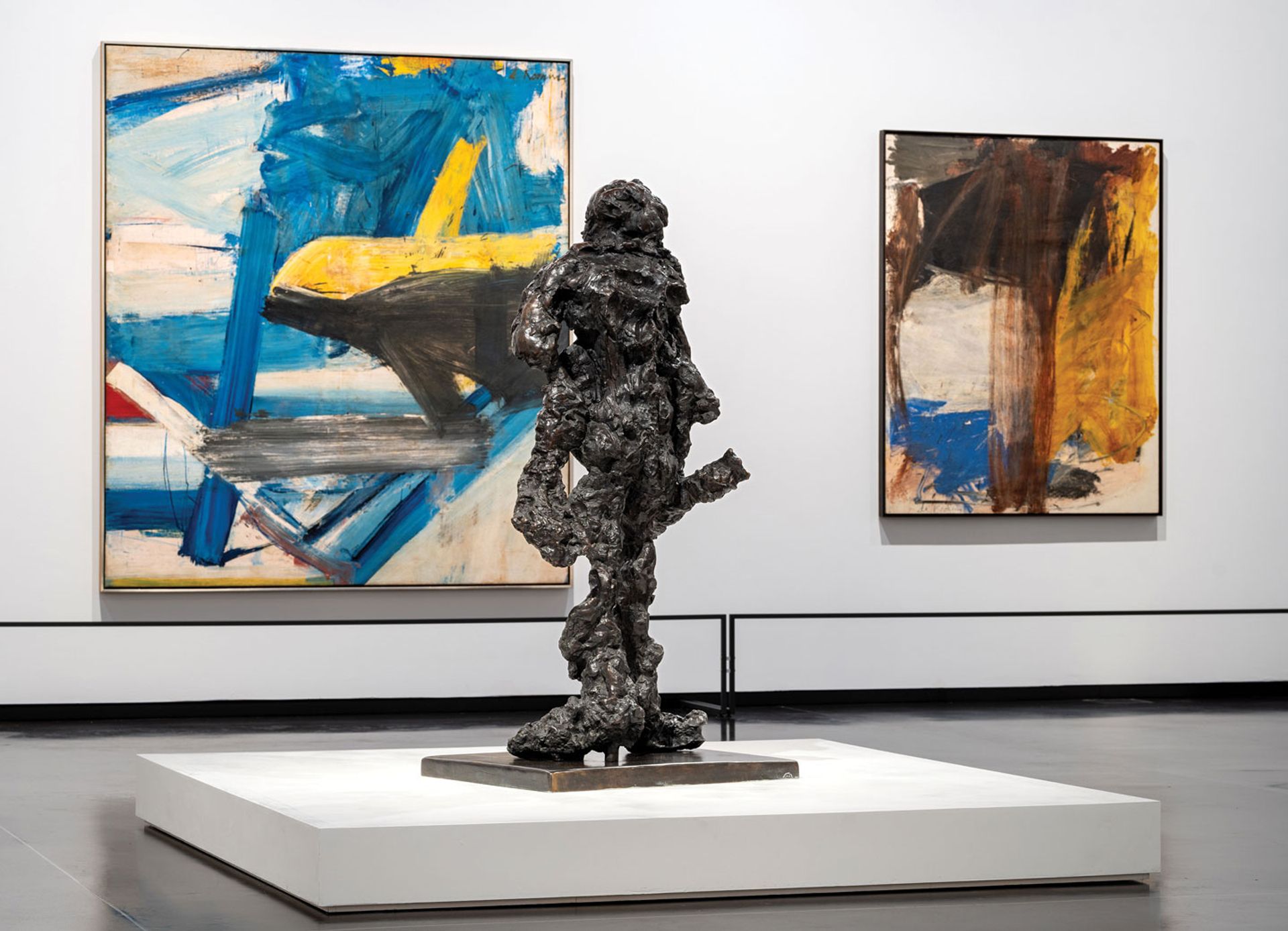 De Kooning's sculpture Clamdigger (1972) in front of Bolton Landing (1957) and Brown Derby Road (1958) Photo: Matteo de Fina; 2024. © 2024 The Willem de Kooning Foundation; SIAE