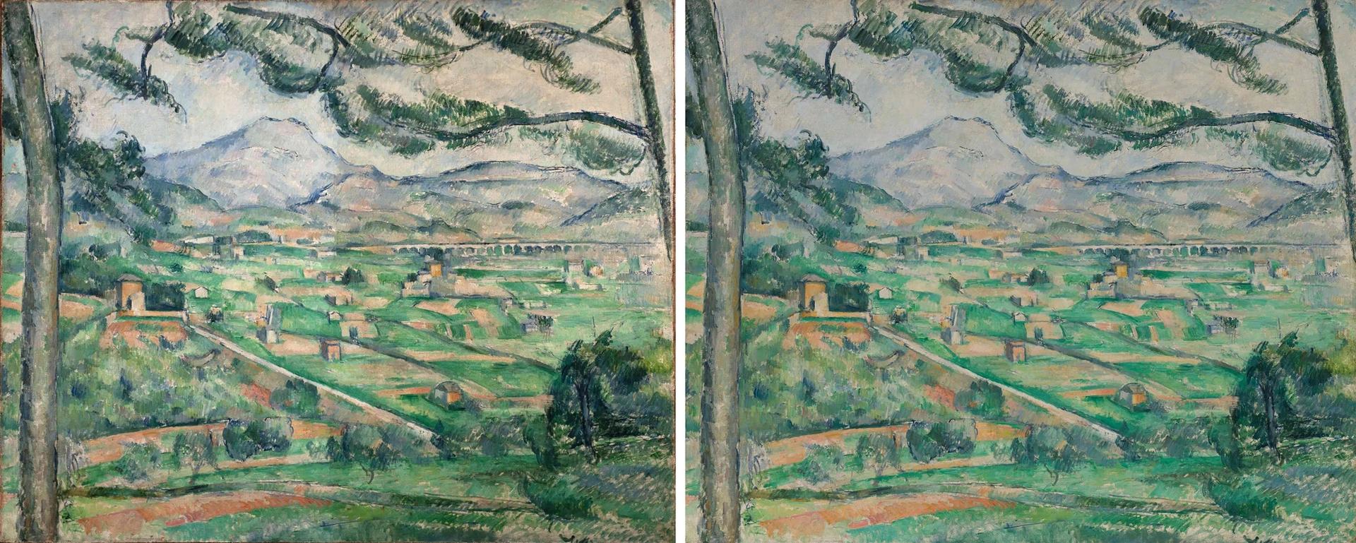 Paul Cezanne’s Mont Sainte-Victoire (1886–87), during conservation, with discolored varnish removed from left side but the right side still uncleaned (left) and after conservation (right)