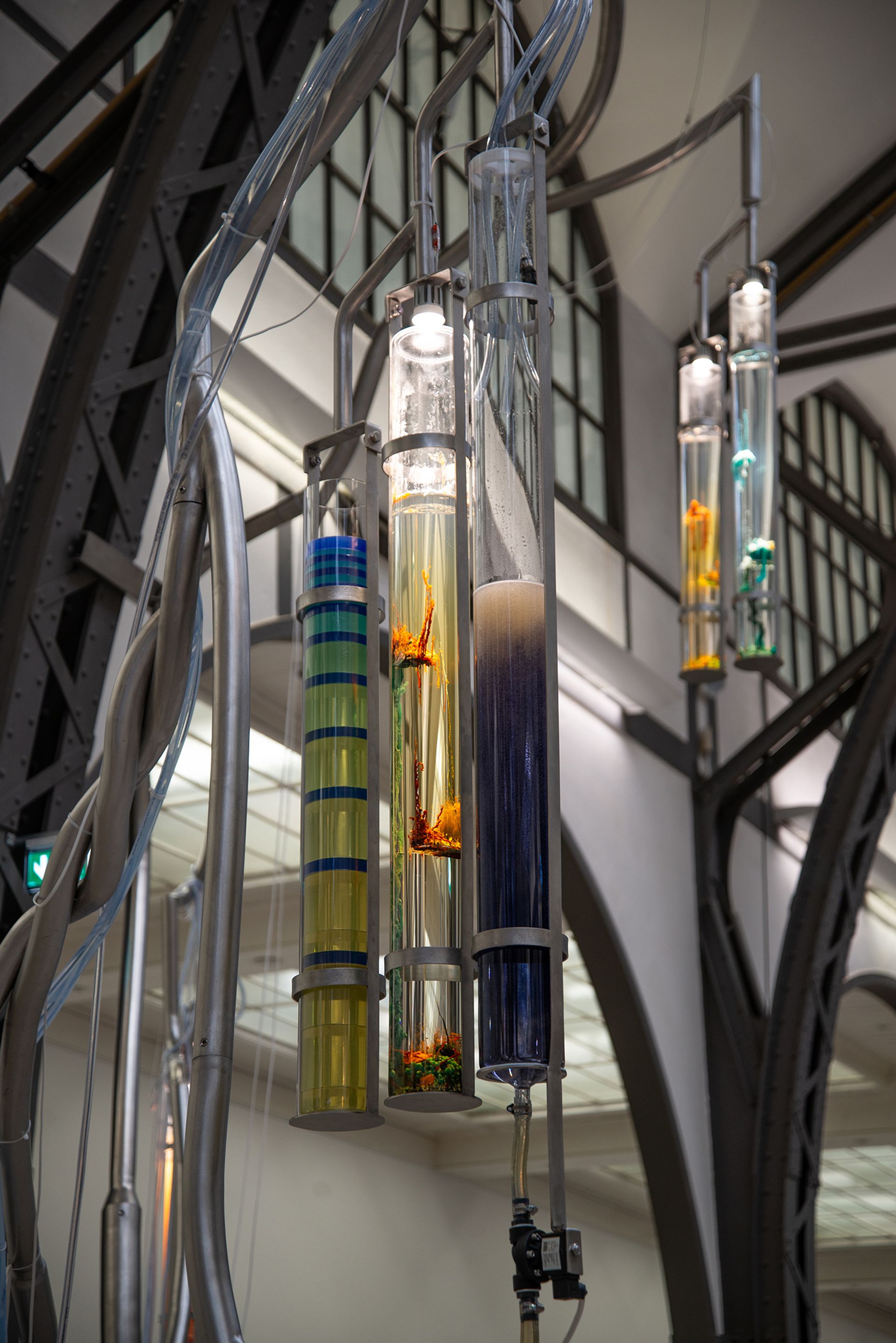 Pirici's "chemical gardens” hanging in outsized test tubes Courtesy of the artist and Audemars Piguet