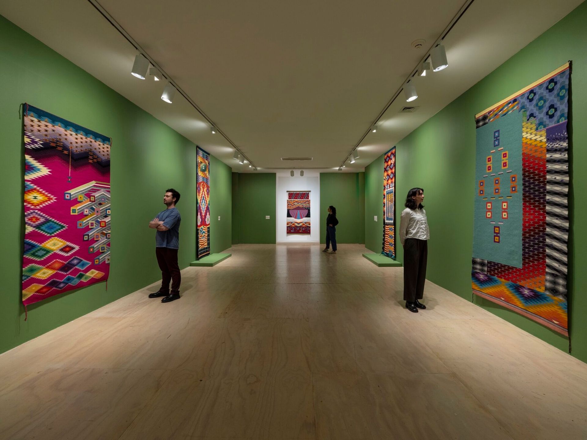 This is the first major museum exhibition for Melissa Cody, a fourth-generation Navajo/Diné weaver. Much of her practice is rooted in the Germantown Revival style: a type of Navajo weaving developed when weavers began to take apart the commercially dyed blankets provided to them by the US government and repurposing the fibres to create tapestries rooted in their own traditions. This style is also indicative of Cody’s work in its harmonious blend of generational practices—while Cody’s work is no doubt an offspring of ancestral tradition, her work is also a bridge towards a new generation of weavers and artists, as well as towards a large, international audience.