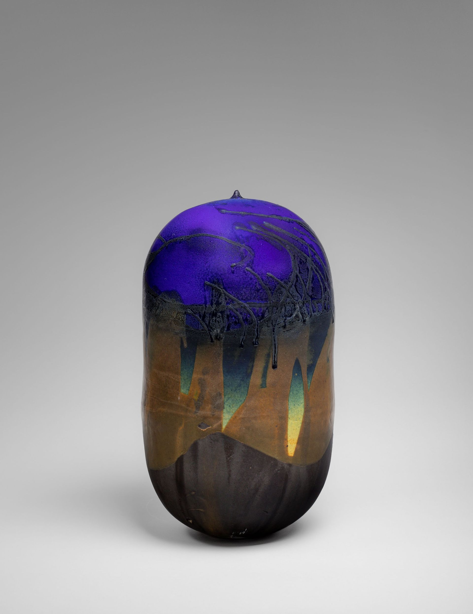Takaezu focused on so-called “closed form” ceramic sculptures, a term that is both descriptive but also a “consciously charged phrase”, according to Adamson. “The use of the term ‘form’ suggests an alignment to modernism and the domain of abstraction,” he says. “The closure results in a withholding of the interior of the object, making it a space only accessible to the imagination, and also an exterior which is totally continuous, which Takaezu then embraced as a painterly field.” G.A.