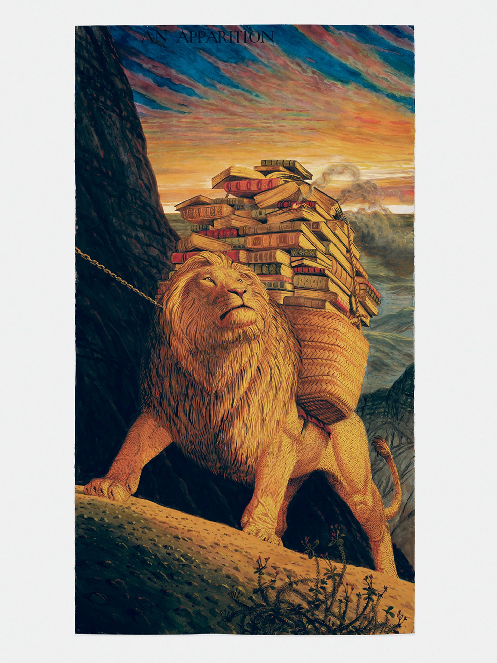 Luckily this work was included, because it’s a very important one of mine. I did a show at Gagosian in Beverly Hills in 2017 that was entirely about California, which has an incredible natural history starting with the settlers and spanning over 500 years until Hollywood. I wanted to mix the two and started researching the MGM lion. Over time, MGM had to refilm the lion; there was a black-and-white one in the silent era, then one when colour was introduced. I thought about all these retired MGM lions. This particular MGM lion is lounging by a swimming pool, and there’s a party atmosphere that is winding down. He looks like he’s drunk or something. He’s a debauched Hollywood type thinking about the old days. The title means “art for art’s sake”, which I thought was hilarious.