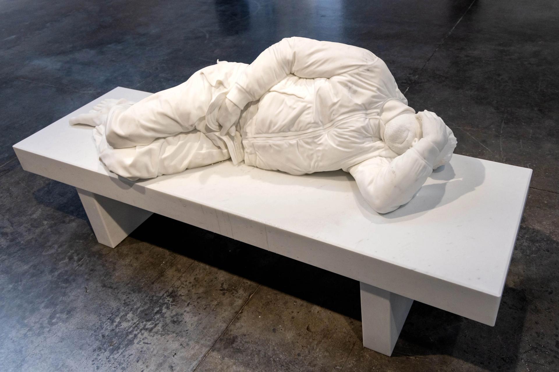 Cattelan's show at Gagosian includes November (2024), an editioned marble sculpture that depicts an unhoused figure urinating on a bench. Steven Molina Contreras