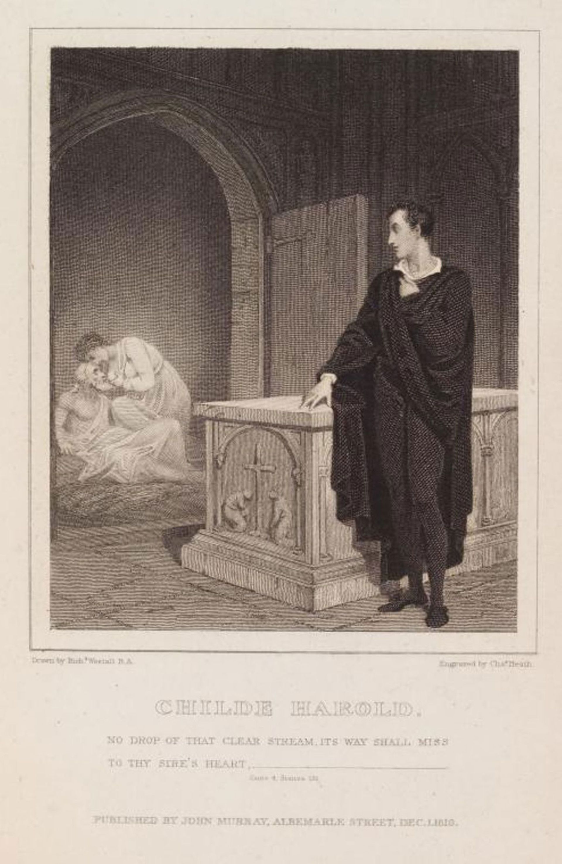 Elided iconography: Charles Heath's engraving of a Richard Westall illustration shows a most Byronic title character in an 1819 edition of Byron's Childe Harold's Pilgrimage Public domain via New York Public Library