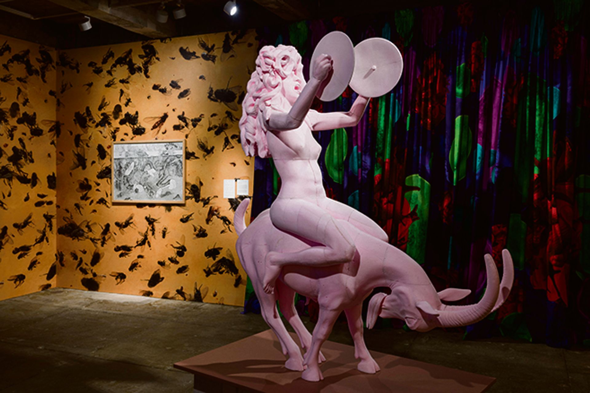 Ines Doujak’s signs and sculptures on display at Cara, alongside her costumes