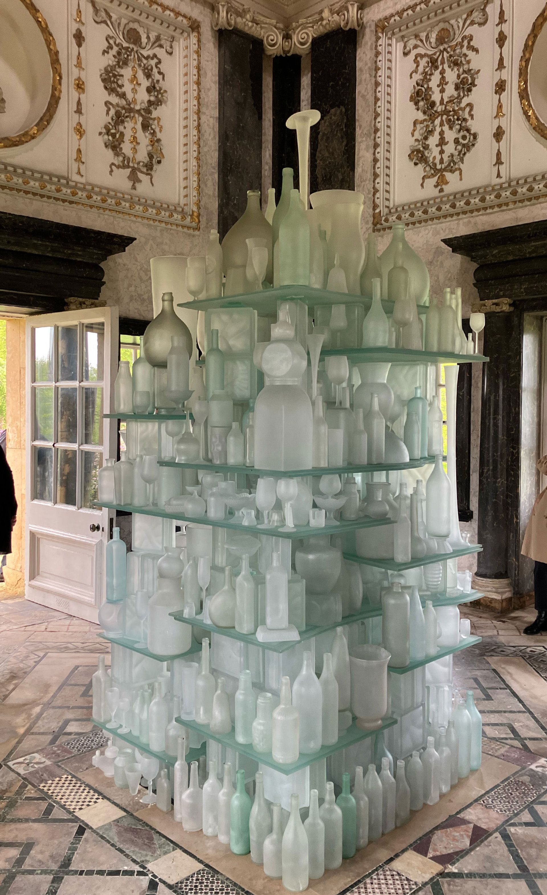 At the Temple of the Winds—situated on a bluff with commanding views over the waterfalls down to the park bridge and the mausoleum beyond and a film-maker's favourite in Castle Howard's performances on celluloid and video—artist and curators have pulled off a moment of magic by placing Eroded Landscapes (1999) at the heart of this small cuboid building, so that this sculpture of stacked sand-blasted bottles and glasses on horizontal sheets of glass can be seen, through the temple's glazed doors, from all quarters. The sense of surprise, as if coming upon a moment of creation in a particularly splendid hermit's grotto, is as arresting as the conjunction of glass sculpture and marble floor, the sculpture rising up towards the temple's coffered ceiling, its walls inset with busts of Classical worthies and adorned with decorative swags and mouldings.