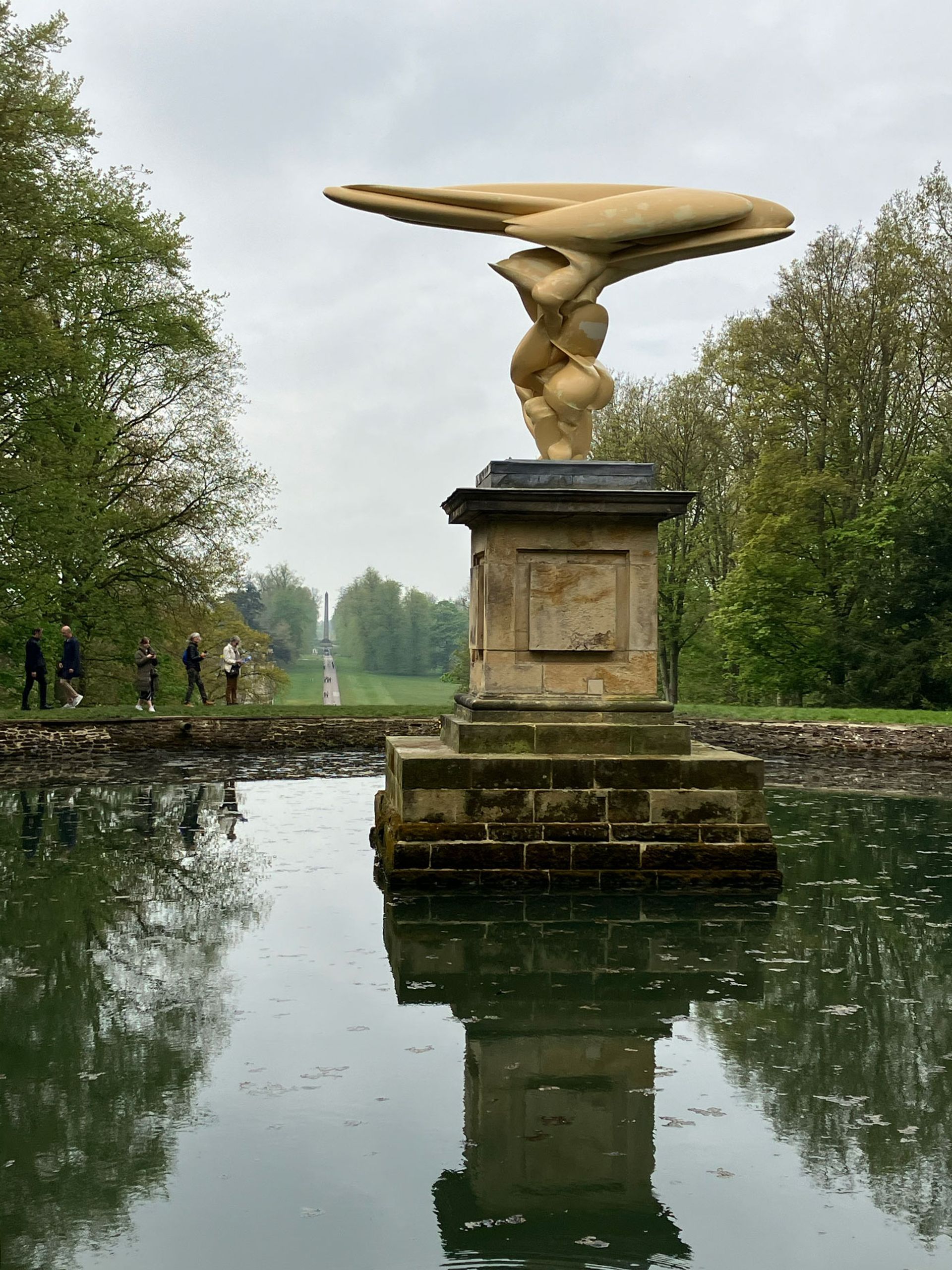 in the upper heights of Ray Wood, artist and curators have boldly placed Over the Earth (2015), a winged design in fibreglass, set in the middle of the circular reservoir that feeds by gravity the displays of the Atlas fountain and the 45ft-tall South Lake fountain. Over the Earth commands the long-straight drive that runs in front of the entrance facade and was put in place by running a scaffold across the reservoir to the plinth at its heart. This particular installation was a demonstration, if one were needed, of the massive logistical challenges of mounting an exhibition of this scale, with some pieces in portable fibreglass but others in weighty bronze.