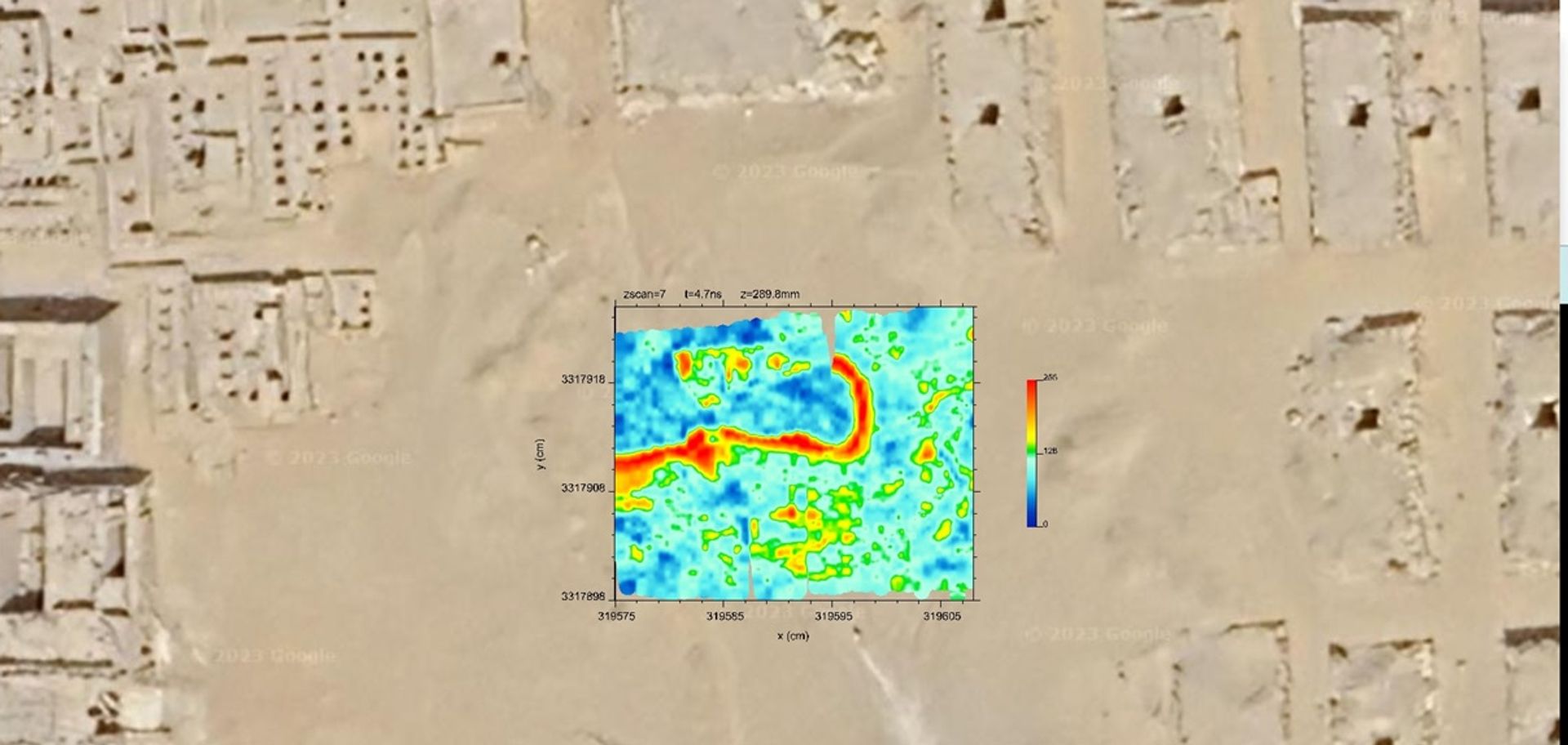 To indicate the shape of the large anomaly, the team then made a further series of surveys using another type of ground-penetrating radar. Their results revealed an L-shaped structure, up to 2 metres beneath the ground and 10 by 15 metres in size. It is perhaps filled with sand, the team write, and may represent a void that was backfilled after construction. It appears to be connected to another structure below, up to 10 metres in depth and about 10 by 10 metres in size.