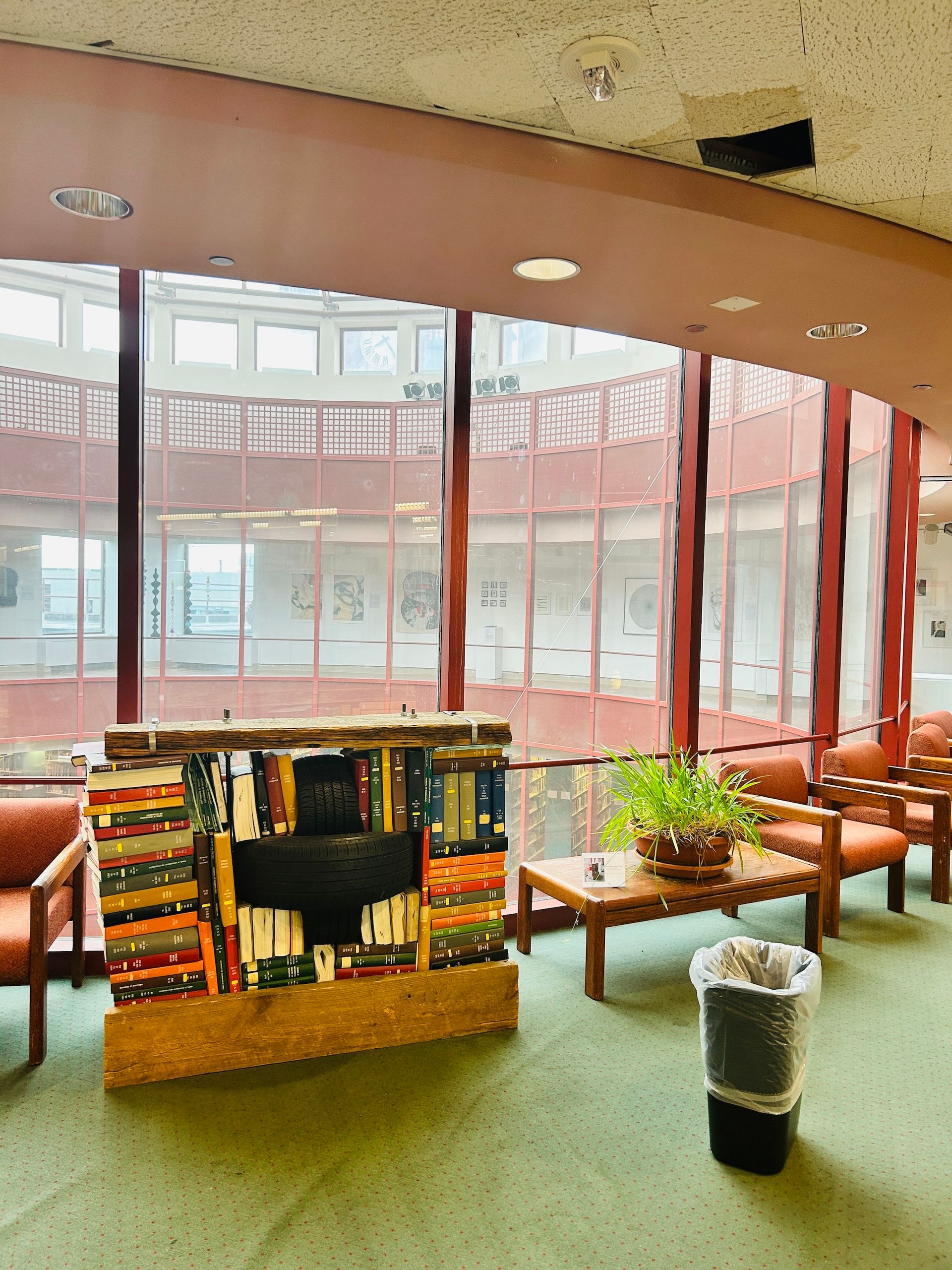 A book installation by Matt Greco and Chris Esposito sits precariously under a leaky ceiling in Queens College's Art Library Photo: Amanda Perez