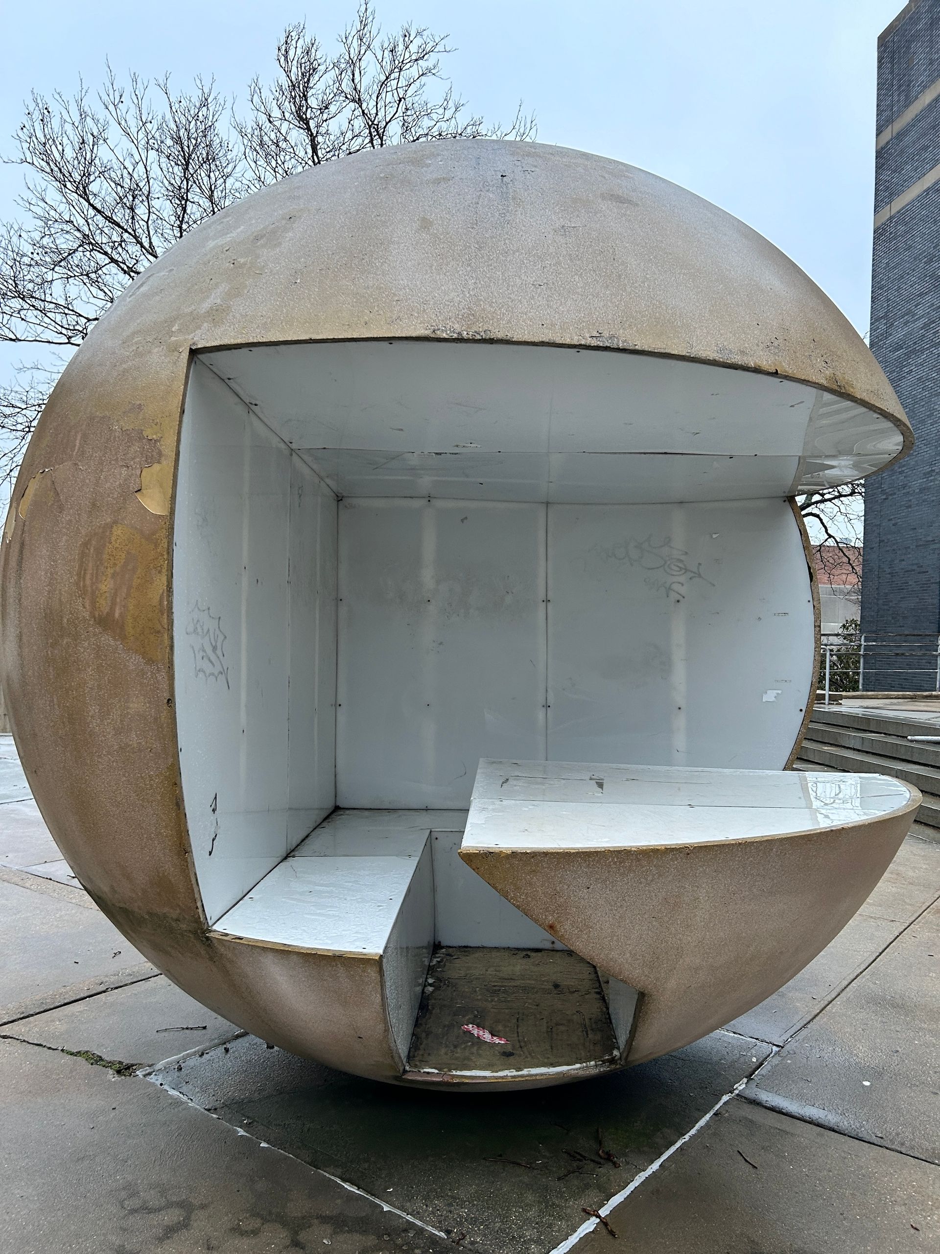 One of Vito Acconci’s Balls for Klapper Hall, slowly disintegrating and covered in years-old graffiti Photo: Amanda Perez