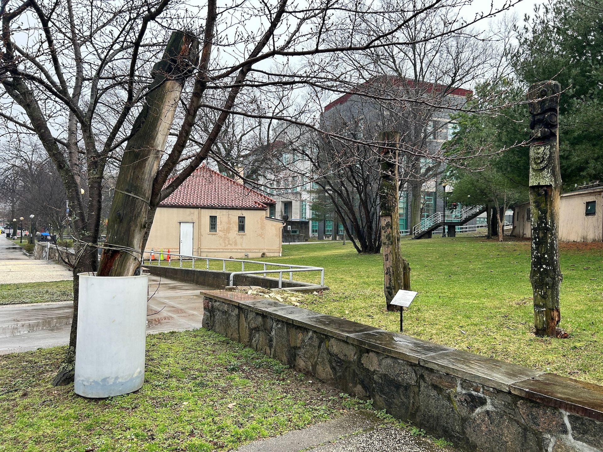 These and other damaged works are clearly visible across campus. Jong-Heung Kim’s Jangseung (2010), an outdoor installation of four vertical carved wooden poles, is mouldy and decaying. One pole appears to have broken and is currently in a plastic bucket and tied to a nearby tree to keep it vertical. An old website featuring several outdoor works at Queens College shows what the work previously looked like. While the images are undated, the social-media links range from 8 to 13 years ago. (Information on some of these links indicate the website was originally created by students at Queens College.)