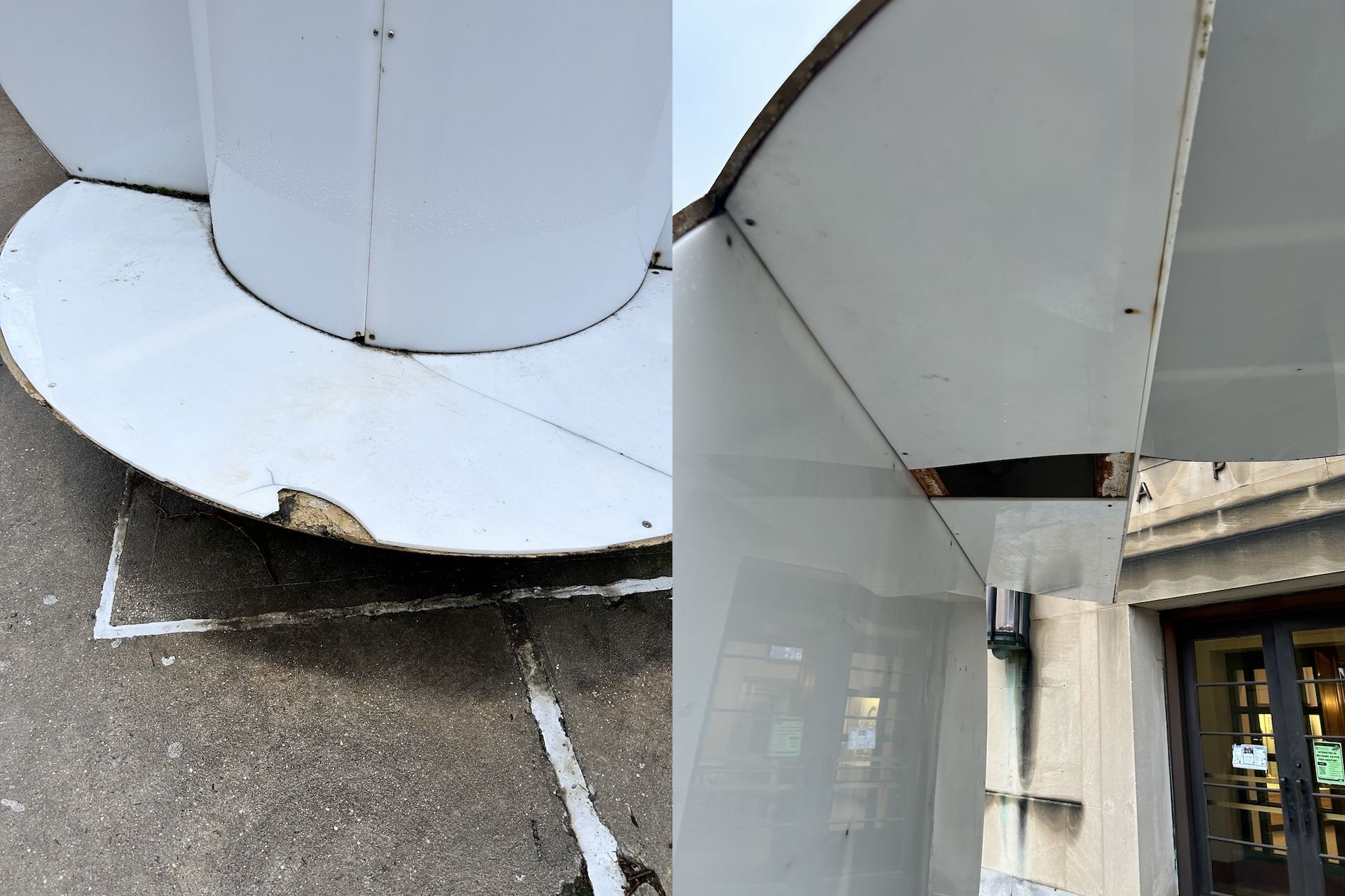 Close-ups of damage to two of Vito Acconci’s Balls for Klapper Hall Photo: Amanda Perez
