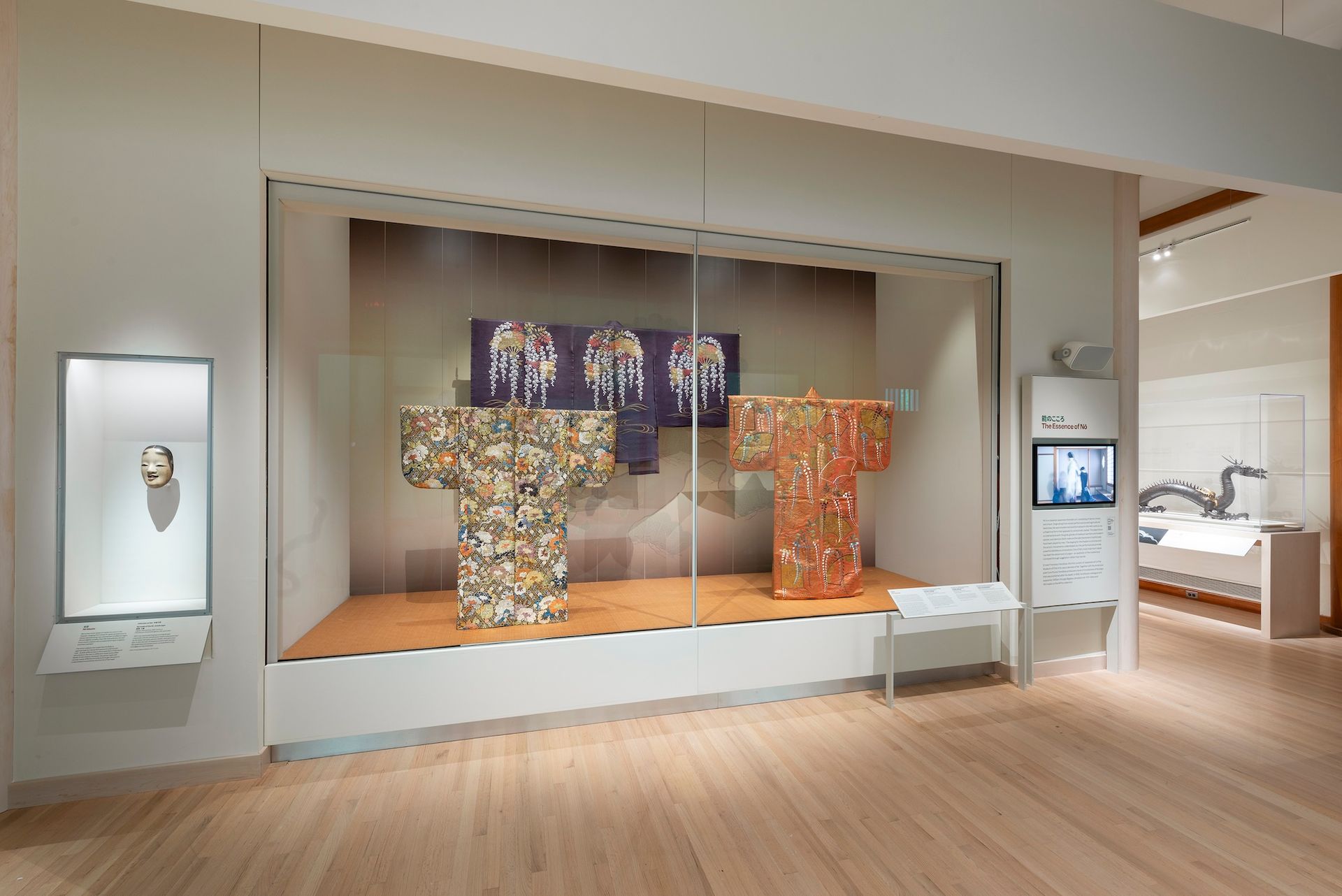 The gallery’s featured works are presented in context and will rotate throughout the year. For example, the Nō theatre costumes are hung to showcase the gleaming artistry of the woven materials along with a single mask and contextualised in an adjacent video.