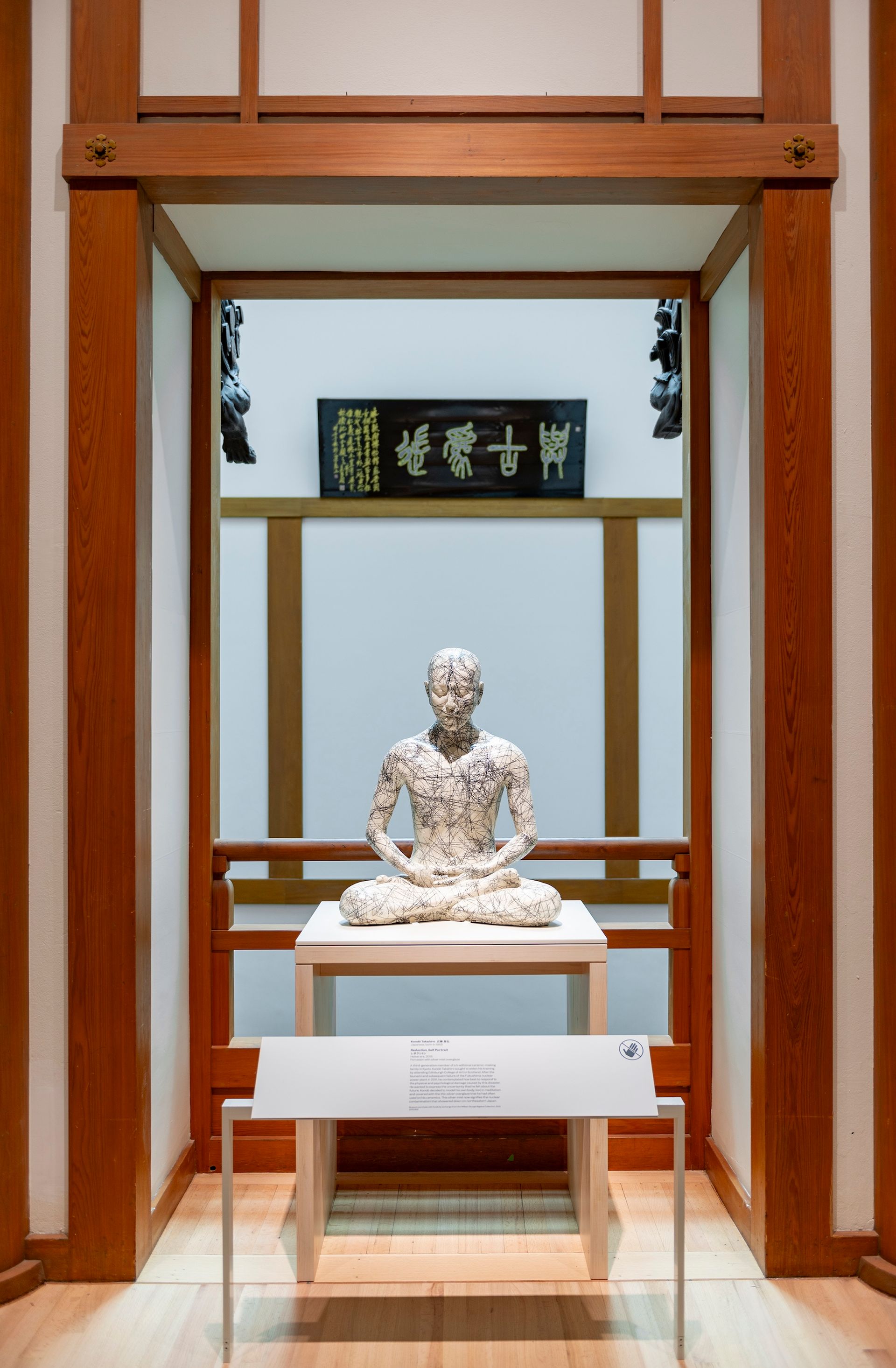 The introductory gallery, Art of Japan, is structured to anchor visitors in what they might consider familiar materials, including Nō theatre costumes, swords and carved netsuke. But the lead-in to this space is a contemporary work—Reduction, Self Portrait (2014) by the Kyoto-based, third-generation ceramicist Kondō Takahiro. The sculpture, a likeness of the artist in meditation, explores the aftermath of the 2011 earthquake and Fukushima nuclear disaster. Morse selected the work in part because of how Kondō imbues traditional ceramics with modern, proprietary glazing techniques.