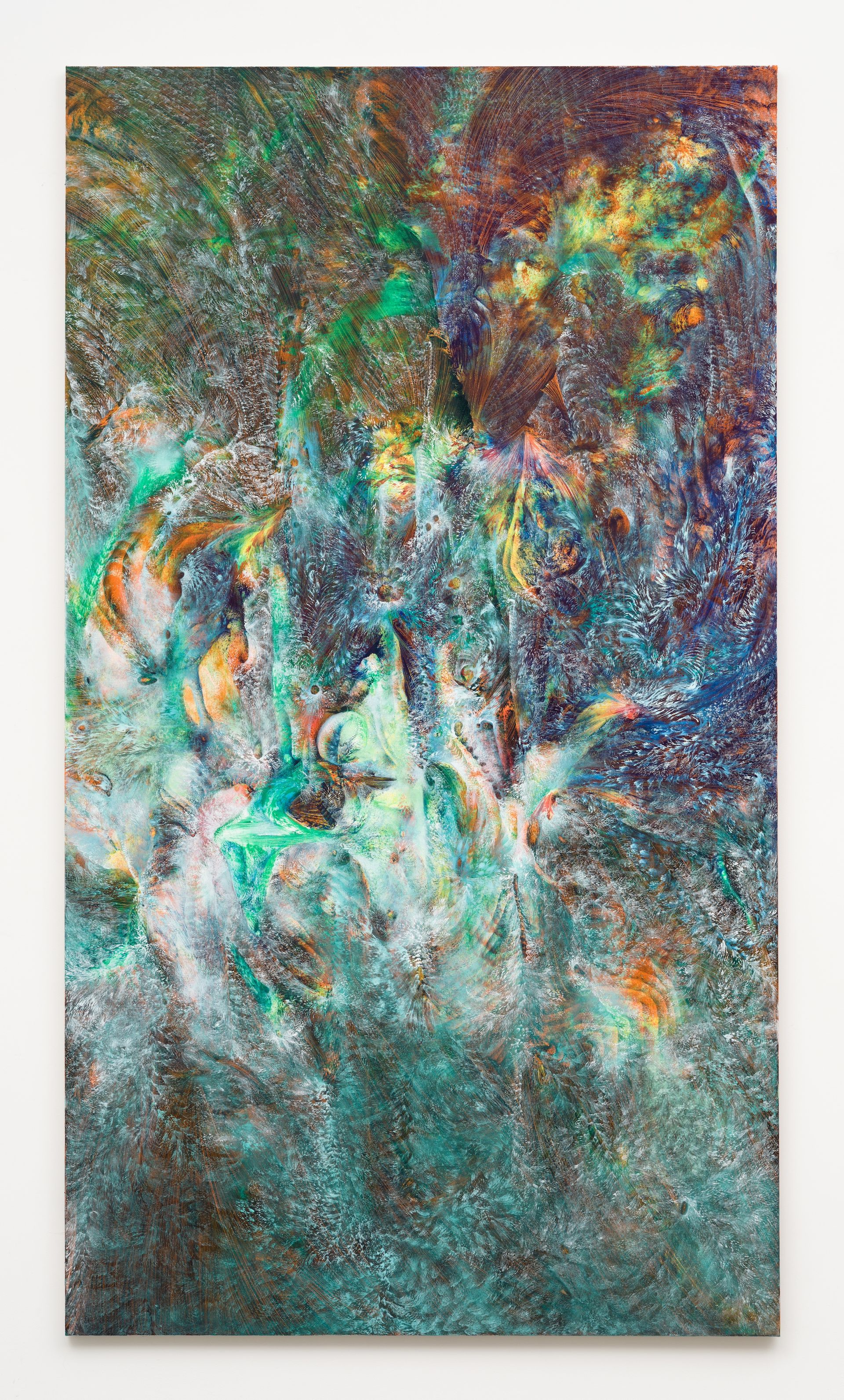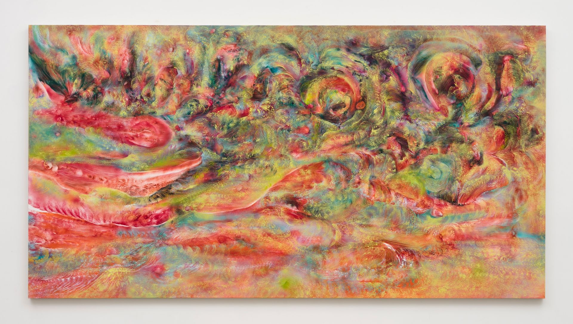 But her pell-mell technique belies its slow, hypnotic effects. In Bull’s art, gestural marks and acid-washed whorls of colour overlap and blend, seemingly in real time, crystallising into recognisability one second before dissolving into kaleidoscopic psychedelia the next. In this stew is a healthy portion of classic Surrealism (the landscapes of Max Ernst in particular) and a pinch of second-generation Abstract Expressionism (Helen Frankenthaler and Joan Mitchell spring to mind). Bull’s paintings also recall Op art, though not necessarily the kind pioneered in the 1960s by Bridget Riley and Victor Vasarely—more like the computer-generated Magic Eye images that briefly dominated children’s books, doctors’ offices and one memorable episode of Seinfeld in the 1990s.