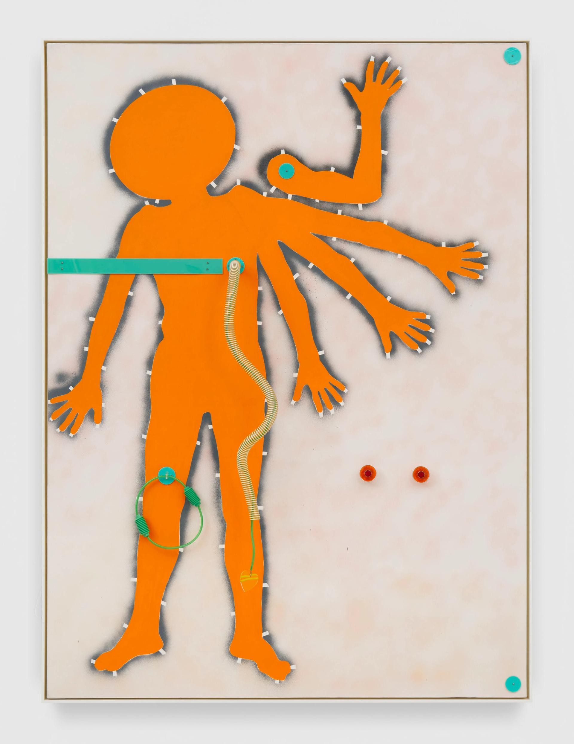 Kogelnik favoured sci-fi speculations over any straightforwardly political commentary on Cold War reality. Body parts often appear with futuristic augmentations, as in the neon-yellow plexiglass work Plug-In Hand (1968) and the painting Artificial Man (1965), whose multi-armed, helmet-wearing protagonist has a plastic heart dangling off a length of tubing.