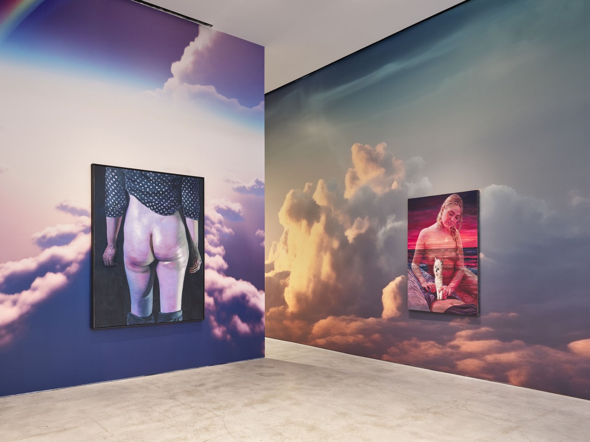 Whatever internal and external politics led to its opening, DETOX is a sight to behold. It features floor-to-ceiling wallpaper depicting clouds and rainbows, upon which larger-than-life portraits of kittens and minimally clothed women and men are hung. The warm hues of the wallpaper’s cloudy vistas and rainbows balance some of the colder tones of the paintings without overpowering them, while also serving as a contextual throwback to early internet aesthetics, and even the standard Windows 95 clouds backdrop. If it may be used as an adjective, the show is very internet, in a way that perhaps Jon Rafman’s work could also be said to be very internet.
