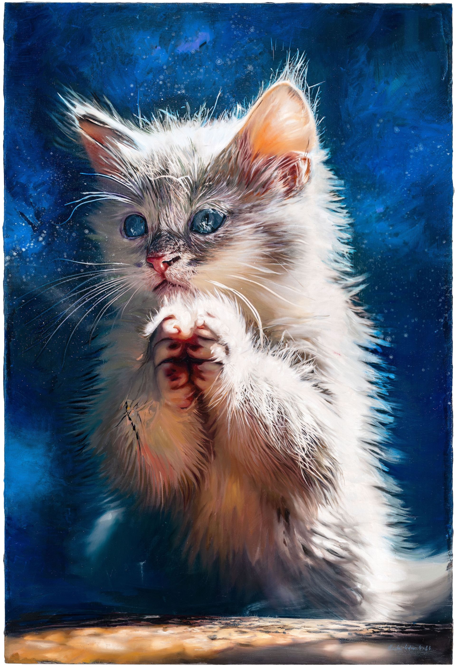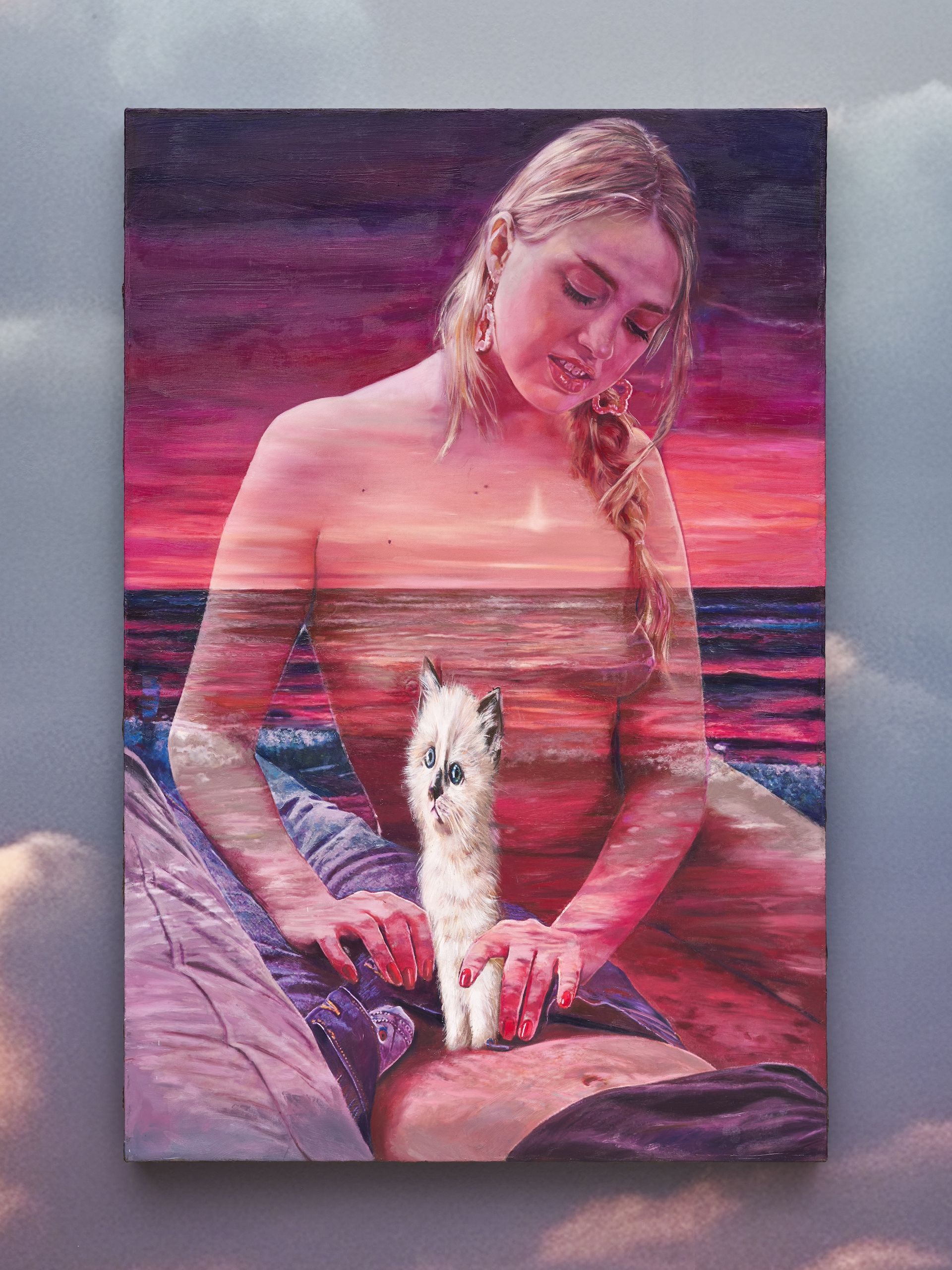 Eder’s hyperrealist painting style is particularly successful when presenting the disconnect between the textural sharpness of a kitten’s face on top of a fuzzier landscape, as though one is viewing a canvas in Photoshop with multiple layers copied and pasted onto one another from different sources, with different pixel densities. Collage is a fundamental part of Eder’s practice, as he pieces elements together digitally before painting them. Through unconventional proportions and shifting textures, he conveys a sense of collage, but these disjunctures accomplish something chronological, too: they underline that the work is not typical of the internet as we experience it today, but rather as it existed in the highly-customisable, kitschy, glitter-trail-at-the-end-of-your-cursor days of early MySpace—that time at the start of the millennium when things on the web did not have visual cohesion, compositional balance or pixel consistency.