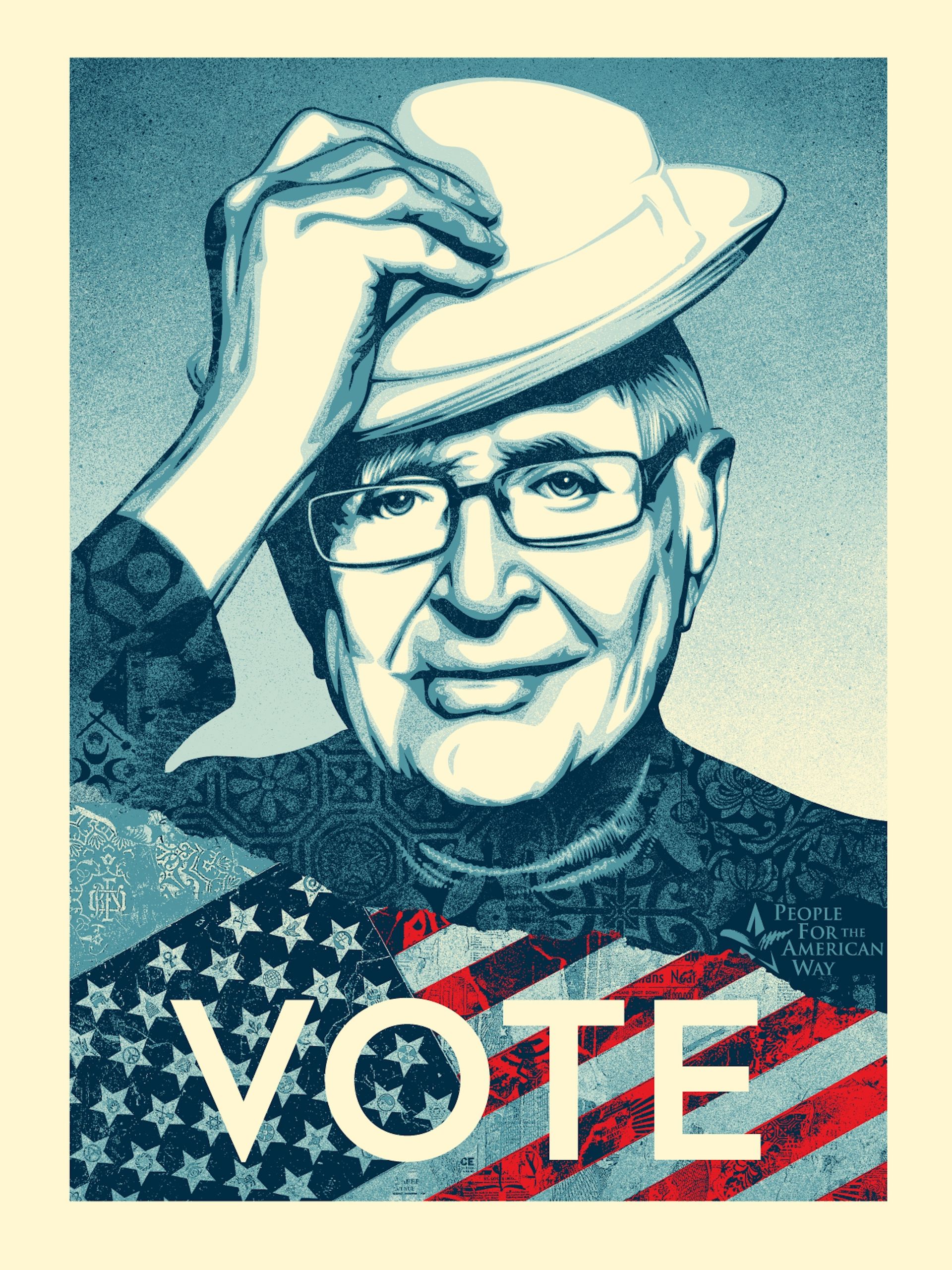 One of the pieces Fairey created for the campaign is a portrait of the legendary television producer Norman Lear, who died in December 2023 at the age of 101. The work is an homage to his life, legacy and founding of People For the American Way more than 40 years ago, to fight back against right-wing extremism and to defend the fundamental liberties established by the US Constitution. Lear’s mission and legacy of using arts and entertainment to impact politics and culture is perhaps even more relevant now than ever before in recent history.