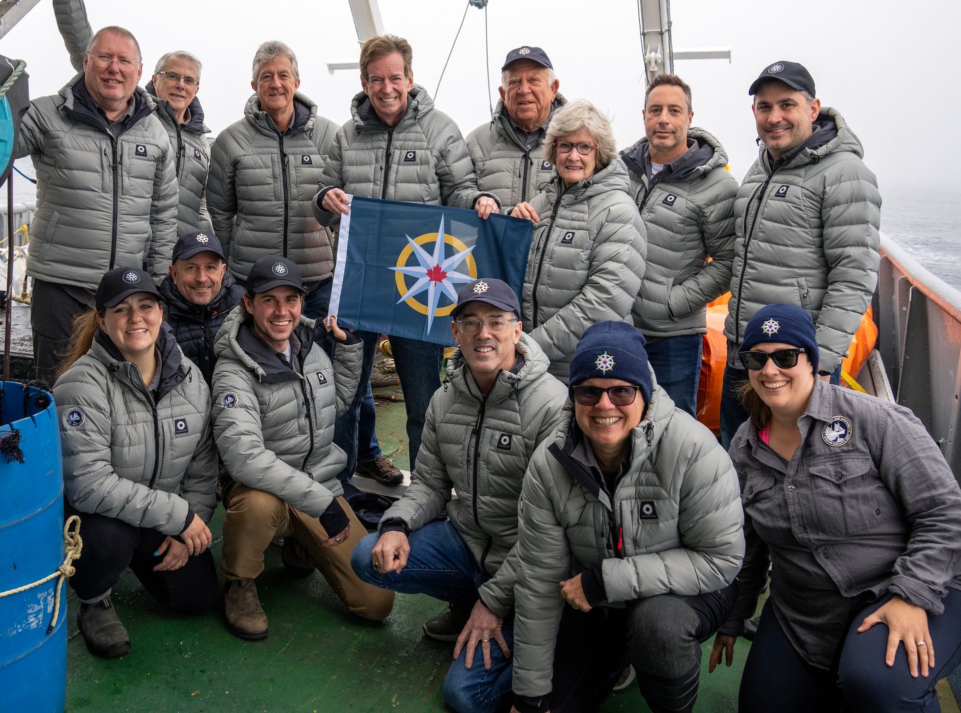 The 2024 Shackleton Quest Expedition team poses with the flag of the Royal Canadian Geographical Society on the deck of LeeWay Odyssey the morning after the find. Standing, left to right: Geir Kløver, Derek Lee, Jan Chojecki, John Geiger, Tore Topp, Katherine Smalley, Mark Pathy and Craig Bulger. Kneeling, left to right: Sarah Walsh, Martin Brooks, Antoine Normandin, David Mearns, Jill Heinerth and Alexandra Pope Photo: Jill Heinerth/Canadian Geographic