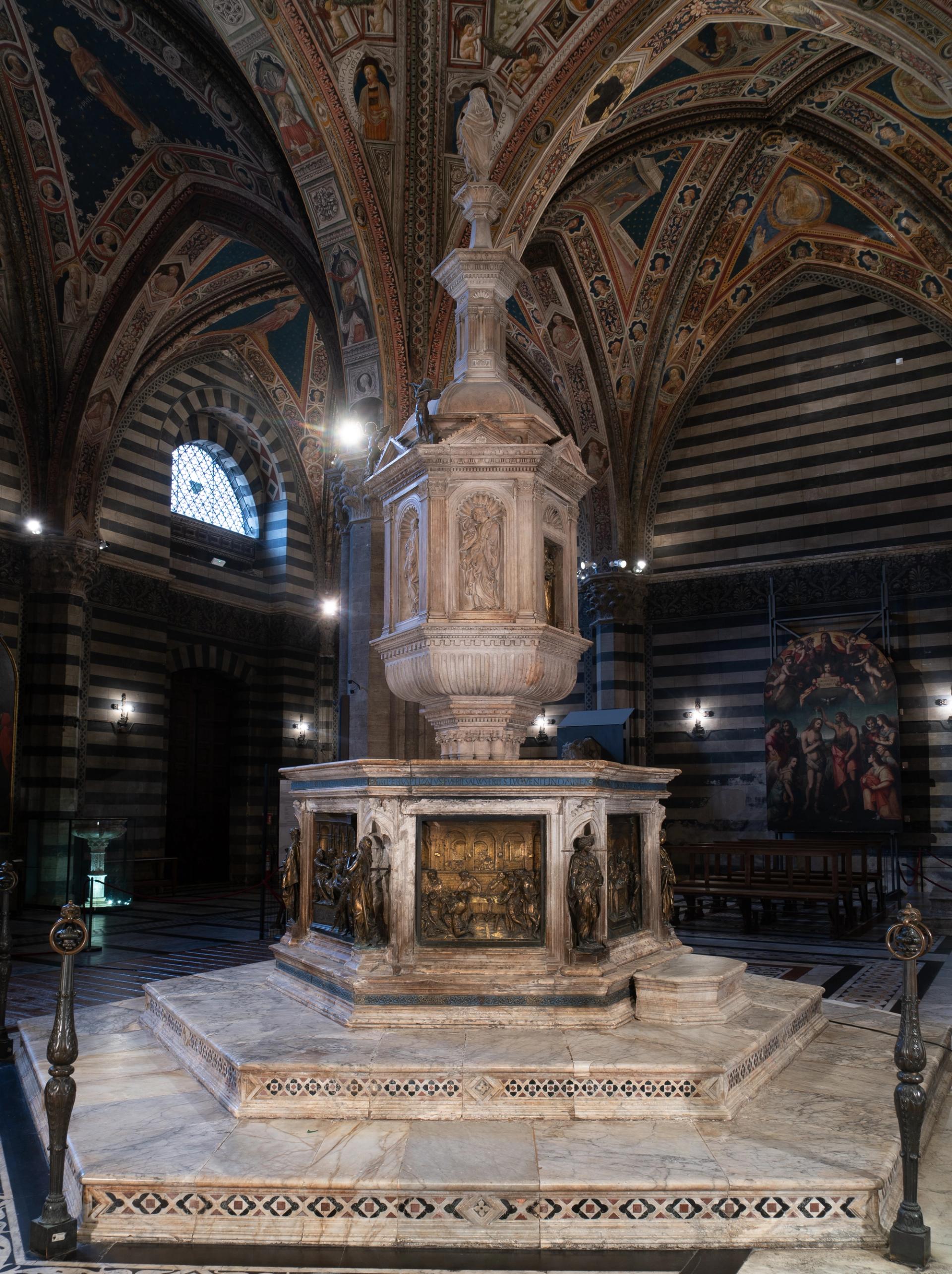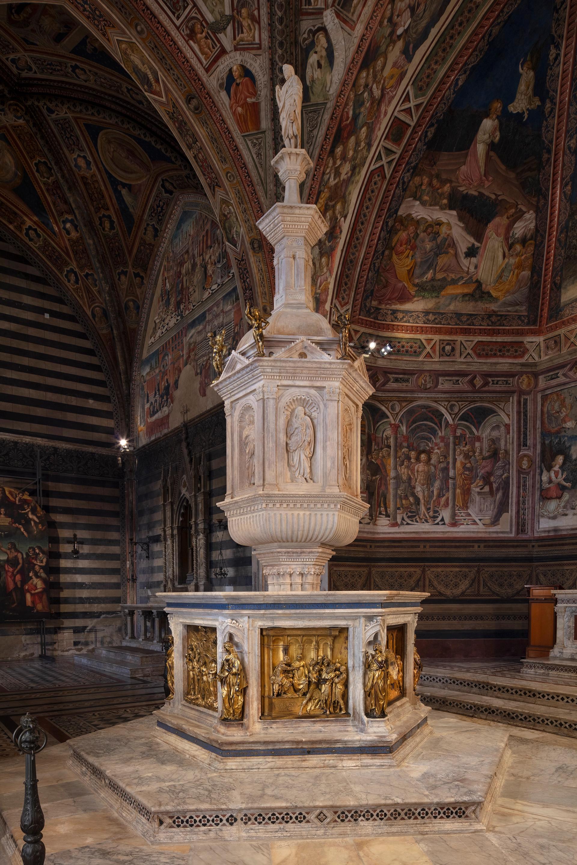 For some six centuries, the immense baptismal font at Siena's Battistero di San Giovanni, located just behind the Tuscan city's zebra-striped Duomo, has been put to regular use in the baptising of local newborns. Art historians have also made much of the 6.5m-high structure. A cupola-topped greatest-hits of the Renaissance completed between 1417 and 1431, it is decorated with major works by Lorenzo Ghiberti and Donatello, the leading sculptors of Quattrocento Florence and pioneers in the application of perspective.