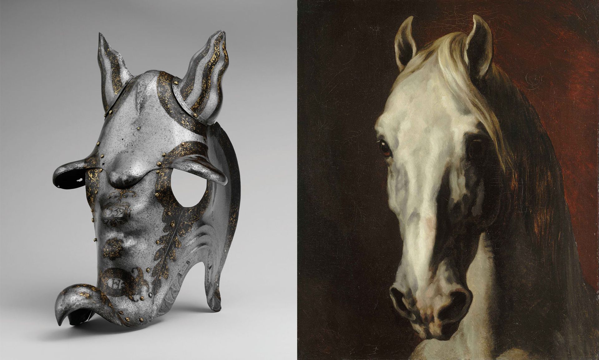 A shaffron, or horse head guard, (left) and (right) Géricault Théodore’s White Horse Head (1814-15)
