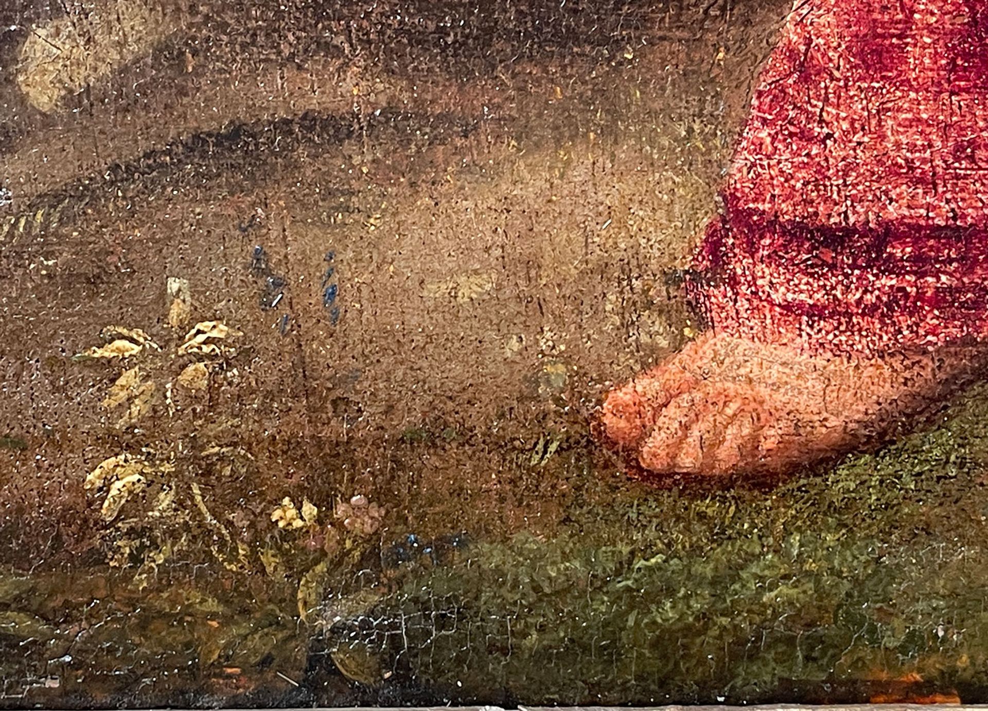Treves argues that distinct parts of the composition evoke the influence of these two masters. The head of Joseph is “the most Bellinesque” element; “beautifully preserved”, she says, with “soft, sensitive rendering of the fluffy beard and the slightly aged dark skin”. But, she adds, “the flavour of this picture is predominantly Giorgionesque, because of this pastoral landscape, that’s the most prevalent influence.”