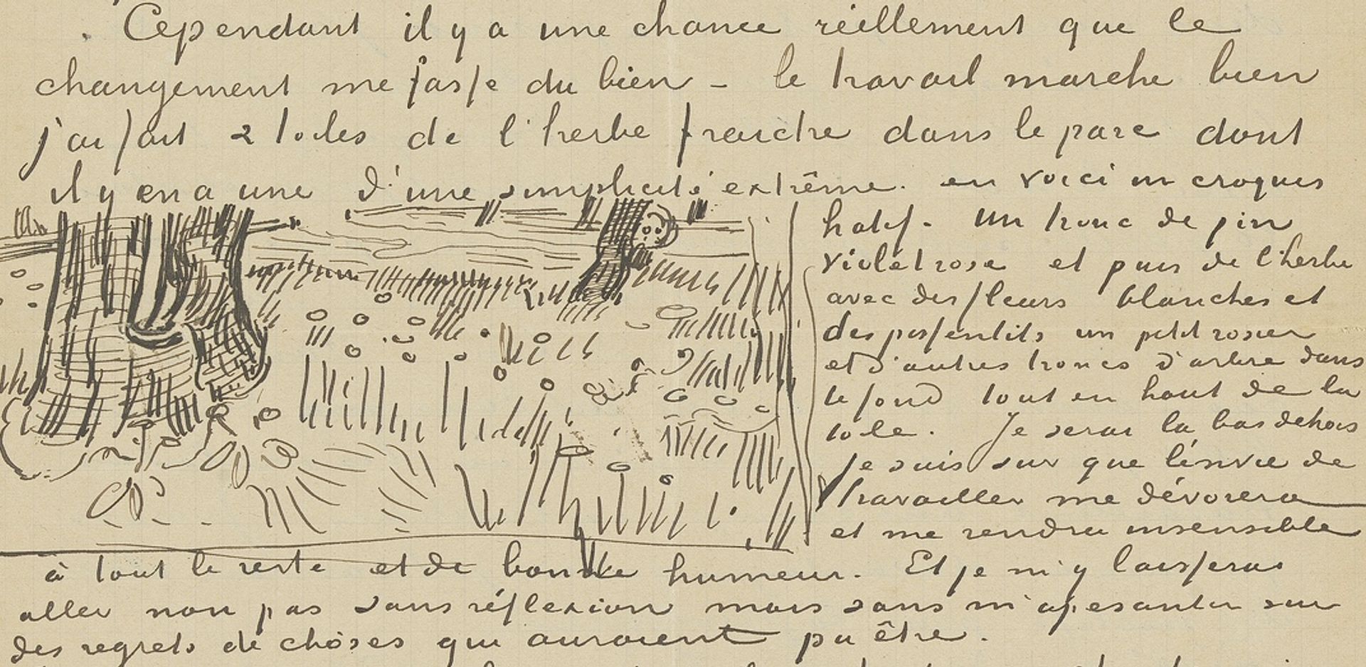 While painting Tree Trunks in the Grass Vincent had written to Theo: “I’ll be out of doors there. I’m sure that the desire to work will devour me and make me insensible to everything else and in a good mood. And I’ll let myself go there, not without consideration but without dwelling on regrets for things that might have been.” Beside these words, he drew a small sketch of the picture he was working on in the garden.