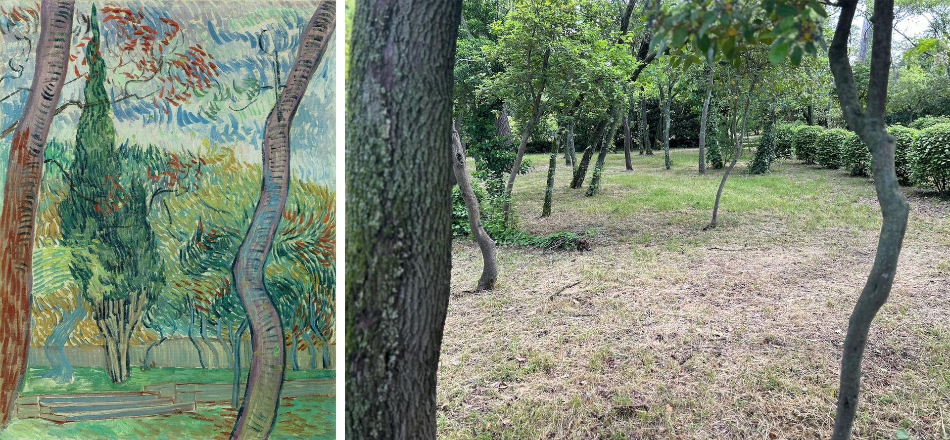 Van Gogh’s Trees in the Garden of the Asylum (September-October 1889) and photograph (April 2024)