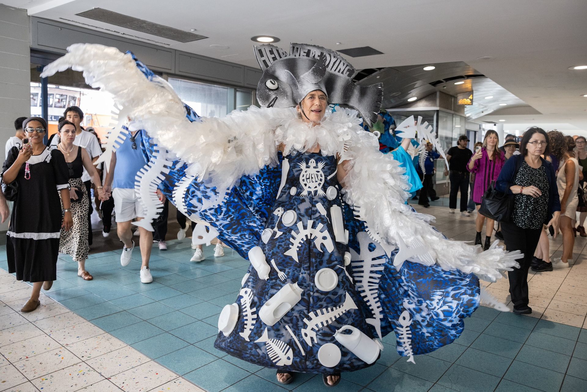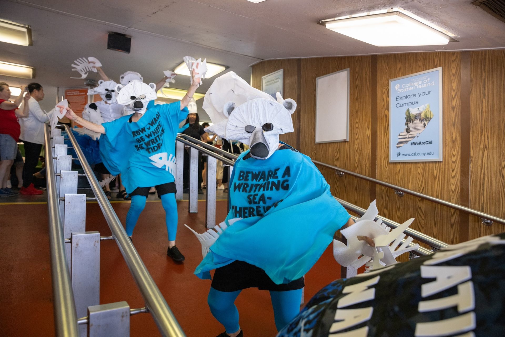 Performers dressed as squealing polar bears and additional marchers bearing adornments seen in Oleszko’s previous shows trailed their pied piper, capturing the attention of ferry riders. The performers’ t-shirts—featuring slogans like “beware a writhing sea” and “there is no planet B”—did much of the talking.