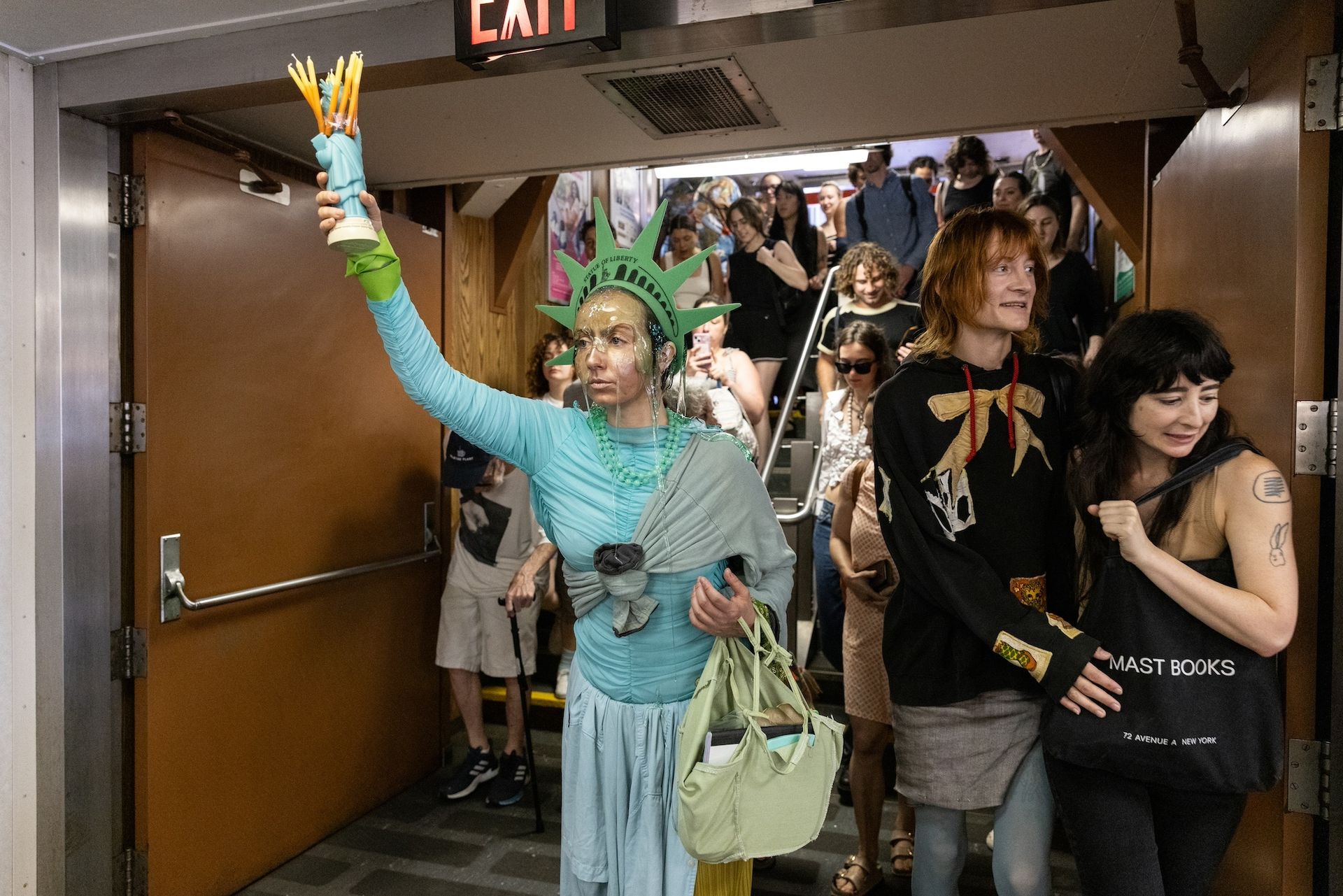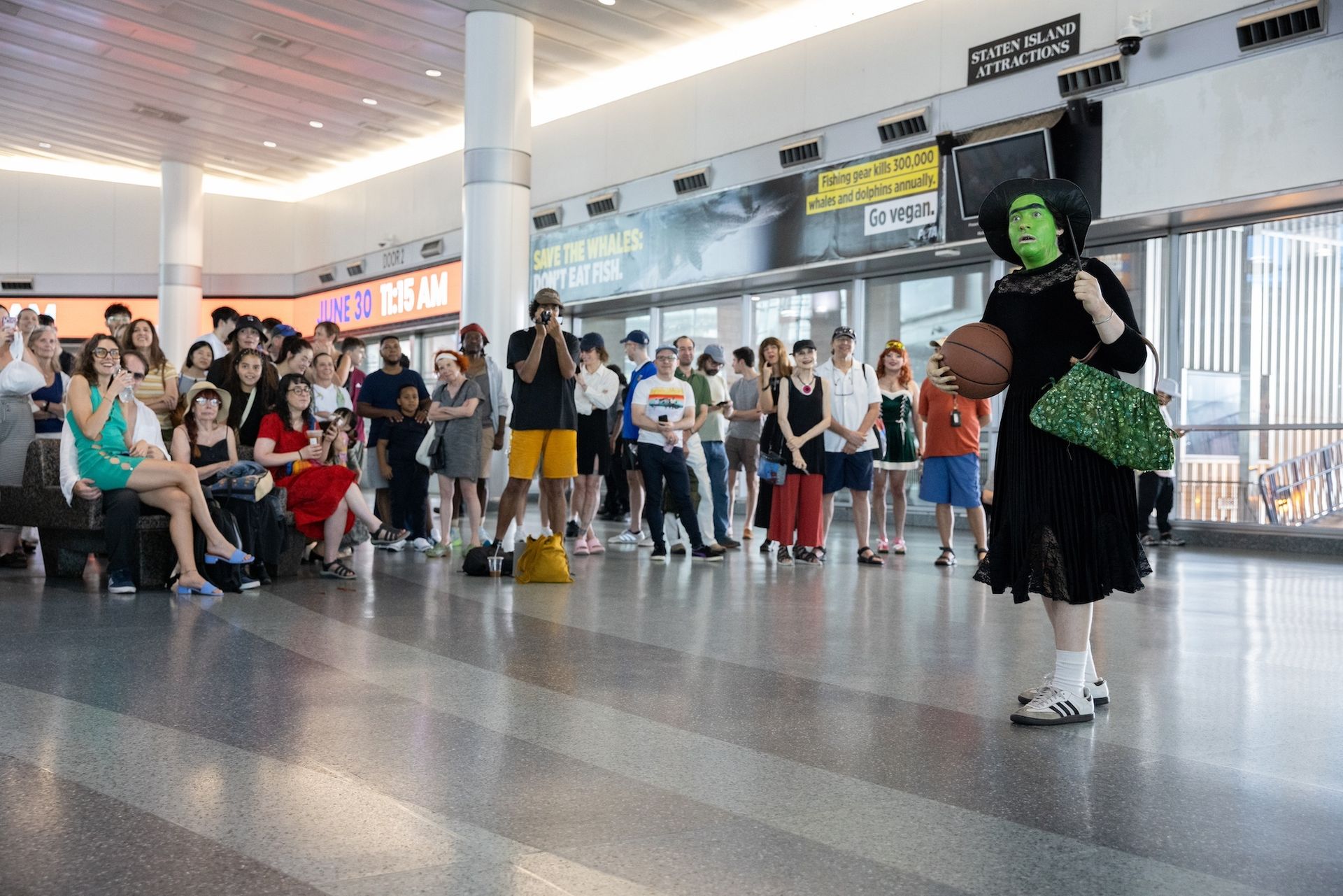 Performance isn’t unprecedented aboard the ferry—which connects Lower Manhattan to Staten Island, New York City’s only Republican borough—but it is rare. The Future Is For/Boating began on the second floor of Whitehall Terminal in Manhattan. Performance artist Alex Tatarsky, dressed as Lady Liberty, marked the meeting point, bearing the giant statue’s distinctive torch and a despondent expression. Once the crowd convened, artist Amando Houser took the floor dressed as their witchy character named DeliaDelia and challenged an attendee to basketball. “Or are you gay?” DeliaDelia taunted, a risqué joke considering the event coincided with New York’s Pride celebration.