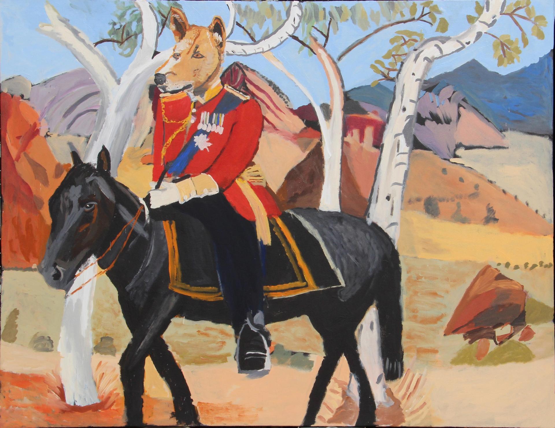Namatjira’s latest suite of paintings is titled King Dingo. The paintings depict a dingo in royal regalia. The Australian wild dog is shown in various poses: astride a ceremonial black horse, standing in the desert and saluting, or wearing a jewelled crown and holding a skull instead of the usual orb.